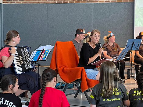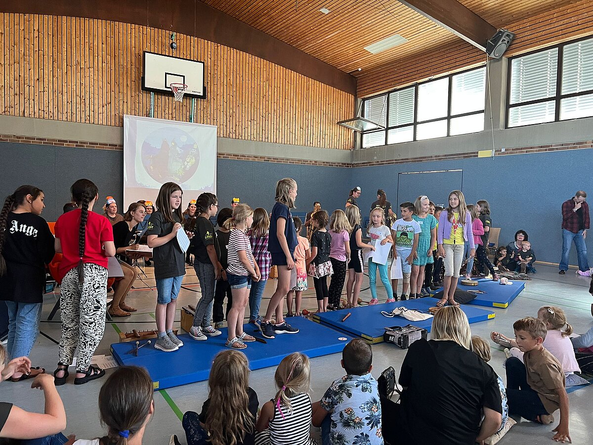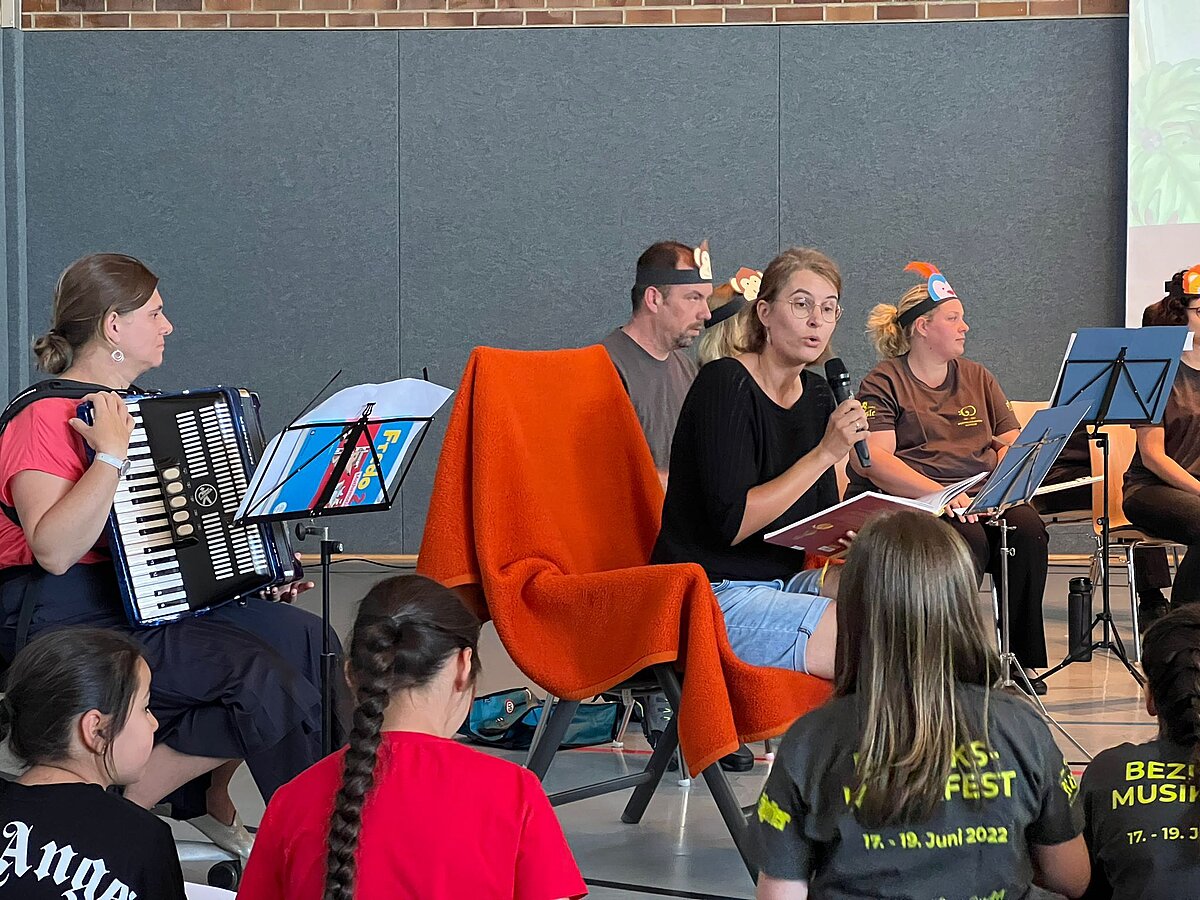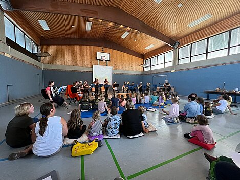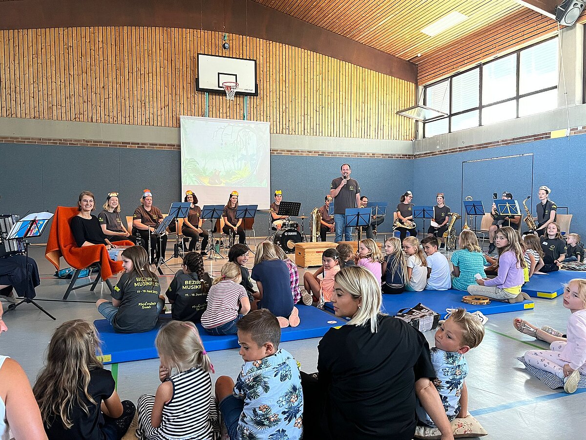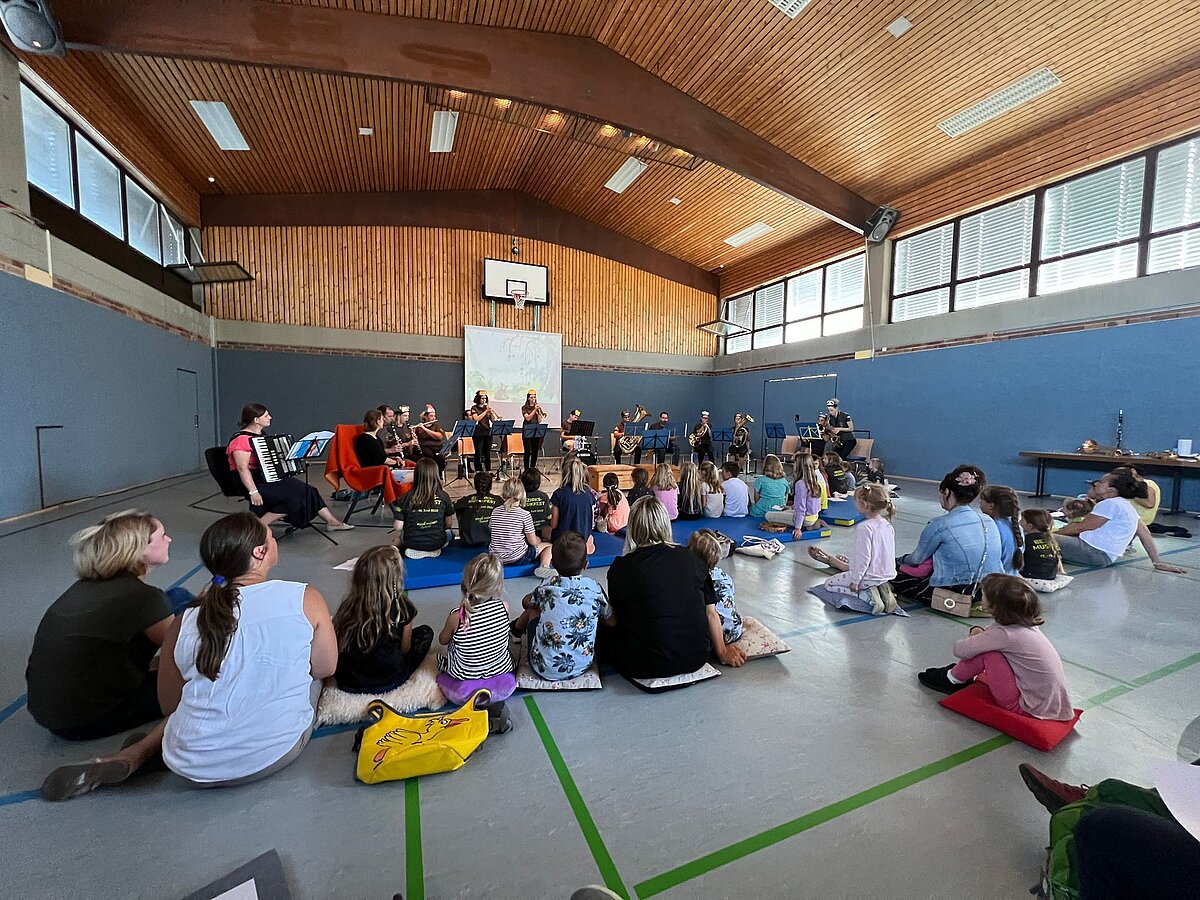 Musikalisch wurden die Dorfmusikanten von den Kindern der Aufheimer Grundschule unterstützt. Im Anschluss an die Geschichte hatten die Besucher des Sitzkissenkonzerts die Möglichkeit, die Instrumente aus der Geschichte selbst auszuprobieren. Zudem konnten Interessierte mit ihren Fragen auf Mitglieder des Musikvereins und einen Vertreter der Musikschule zukommen.