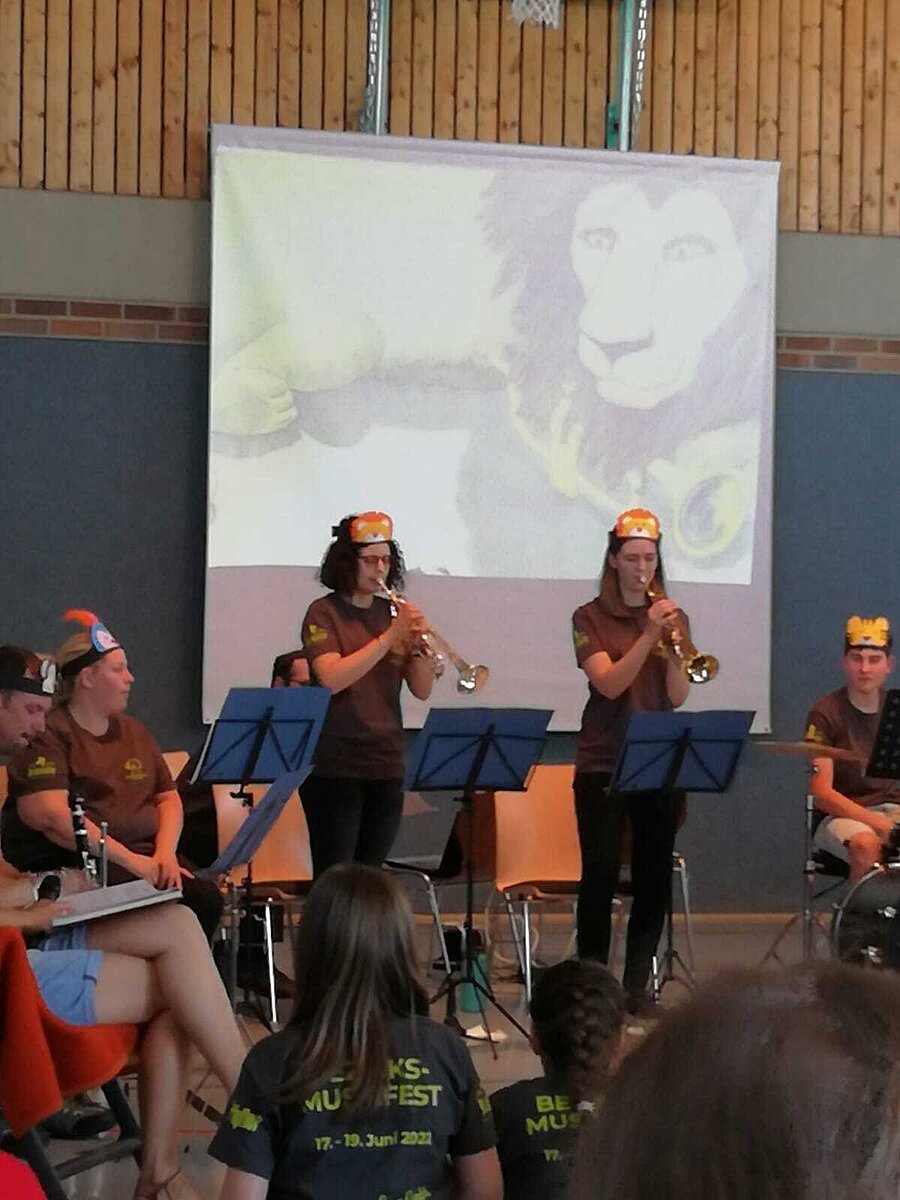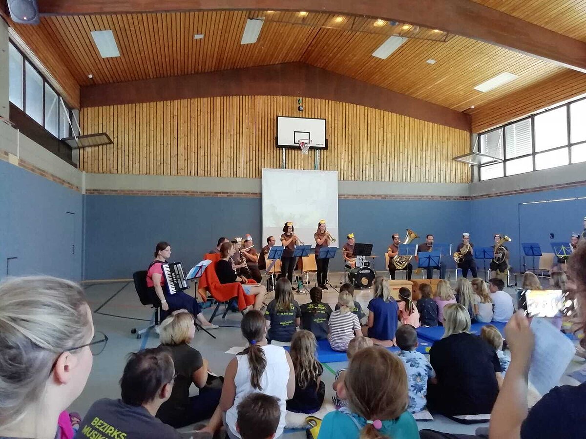 Am Freitag, den 08. Juli 2022 fand das Sitzkissenkonzert der Dorfmusikanten Aufheim in der Bürgermeister-Jehle-Halle statt. Anhand der Geschichte von Ferdinand dem kleinen Bären machten sich die Dorfmusikanten gemeinsam mit den jungen Besuchern des Konzerts auf die Reise in den Lianenwald. Dort sollte Oma Schildkröte am Abend ihren Geburtstag feiern und alle Tiere probten auf ihren Instrumenten ein Stück für sie. Nur der kleine Bär Ferdinand hatte kein Instrument um mitzuspielen. Mithilfe der einzelnen Tiere, die von Musikern der Dorfmusikanten gespielt wurden, konnte der kleine Bär sein Instrument finden.