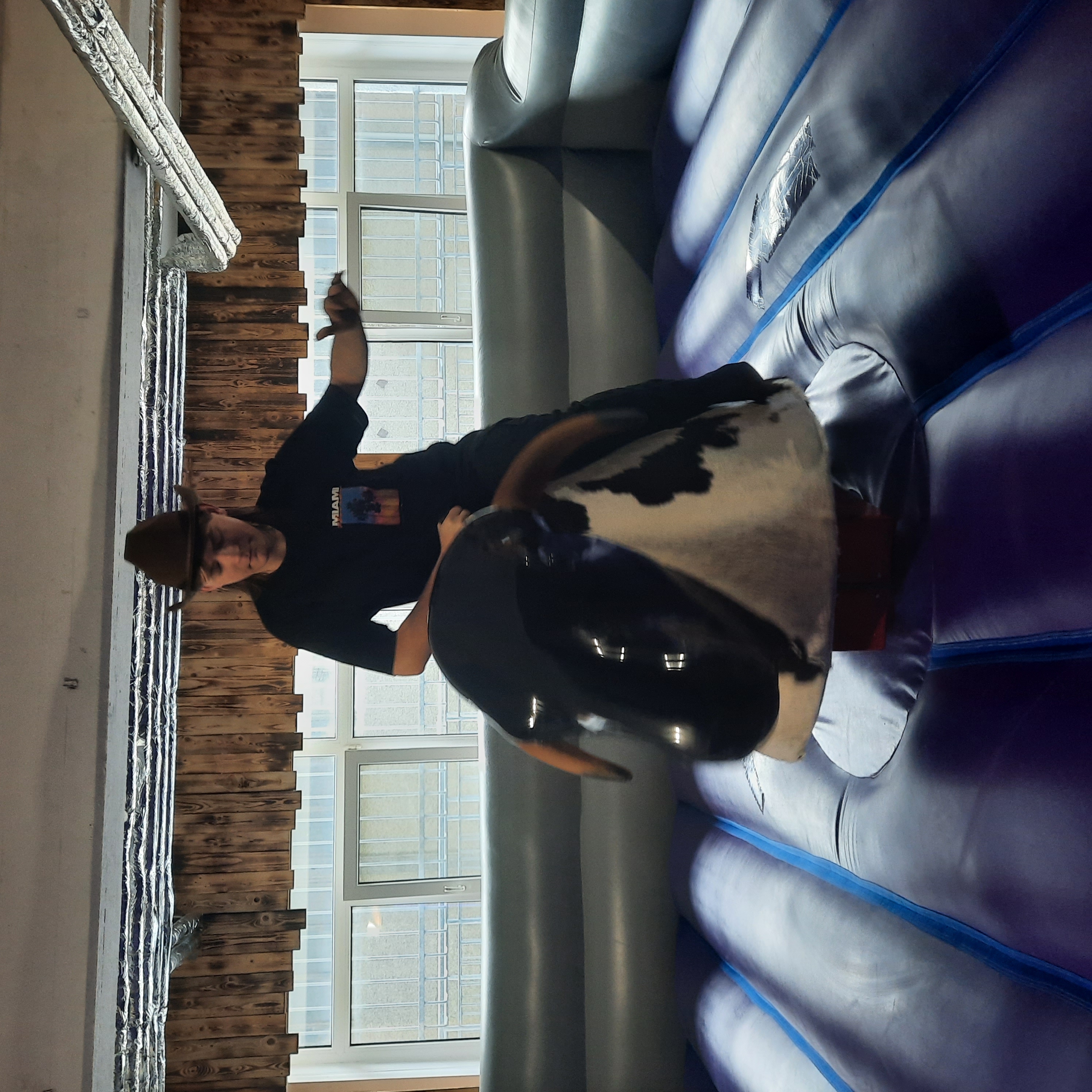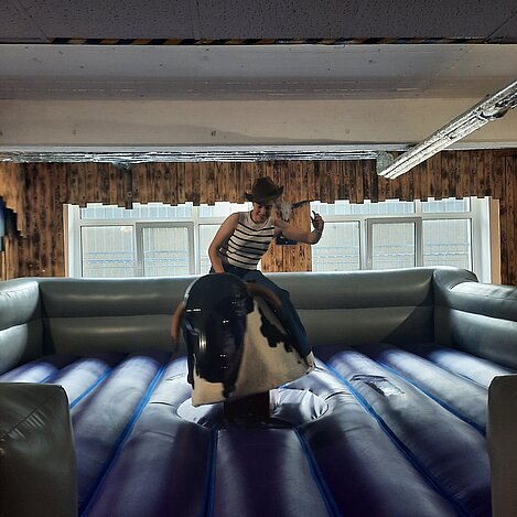 Das Highlight des Tages war das Bullenreiten. In echter Cowboy-Manier versuchten die Jugendlichen, so lange wie möglich auf dem mechanischen Bullen zu bleiben. Dabei feuerten sie sich gegenseitig lautstark an. Jeder gab sein Bestes, um die längste Zeit oben zu bleiben.