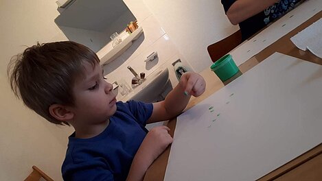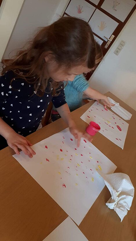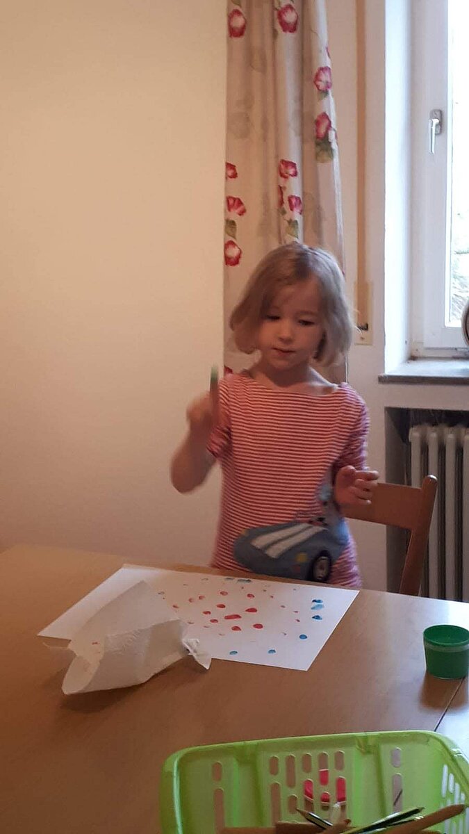 Im Januar machten wir die Bekanntschaft mit dem Zippel-Zappel-Franz und seinen Freunden. Diese tanzten den wilden Zippel-Zappel-Tanz. Und zwar hin und her, auf und ab, rund herum, das war gar nicht dumm. Und zum Schluss kam noch der wilde Indianertanz... Nicht nur mit Instrumenten, sondern auch mit Farbe und Papier konnten wir diesen mittanzen.