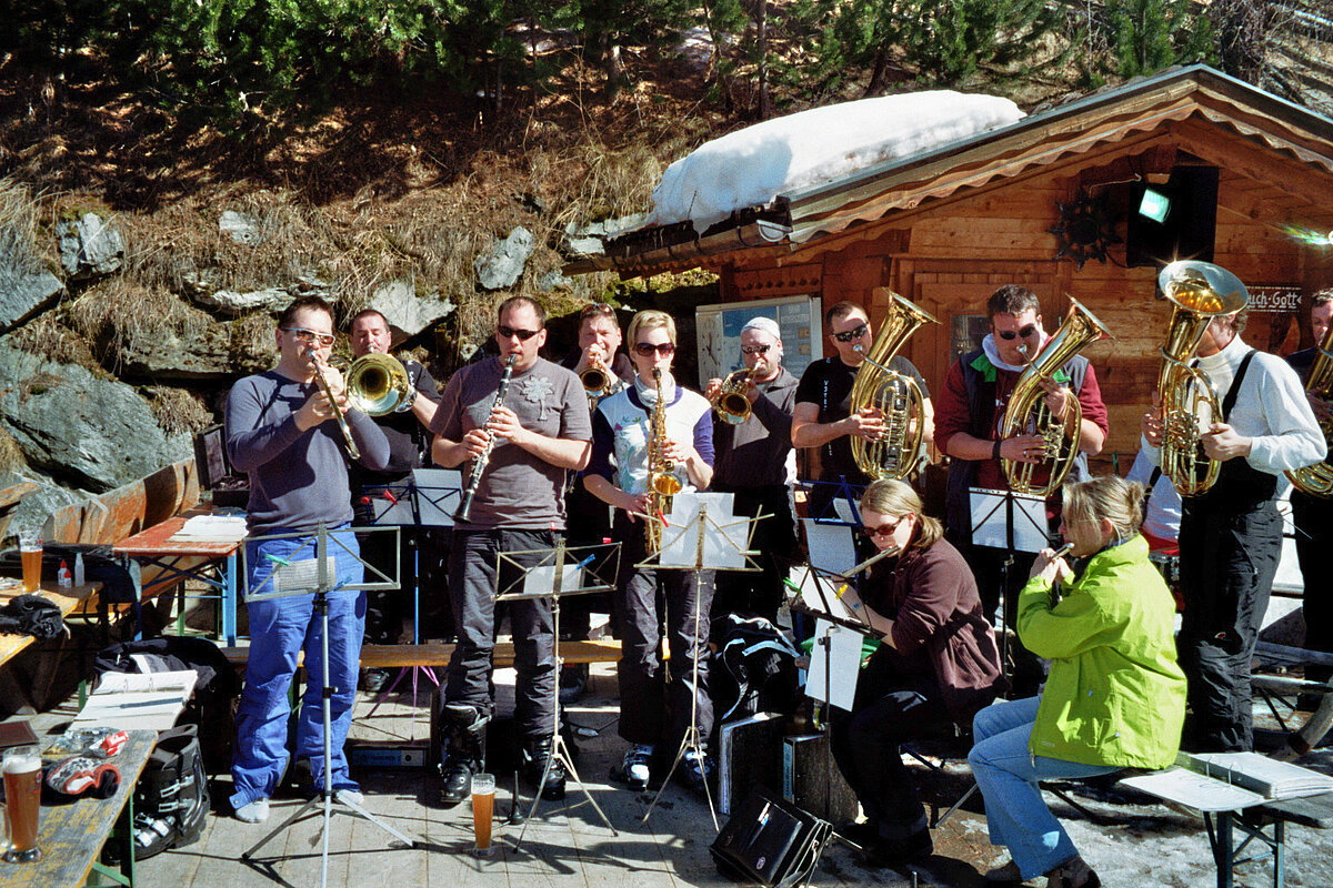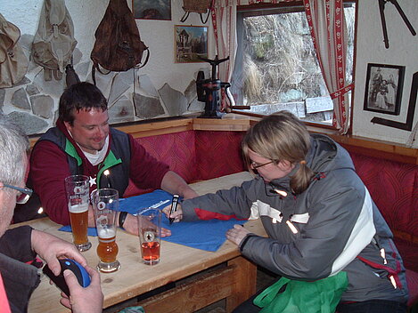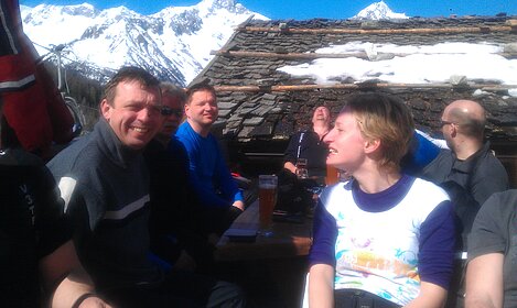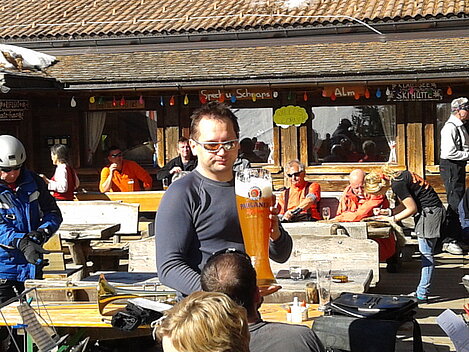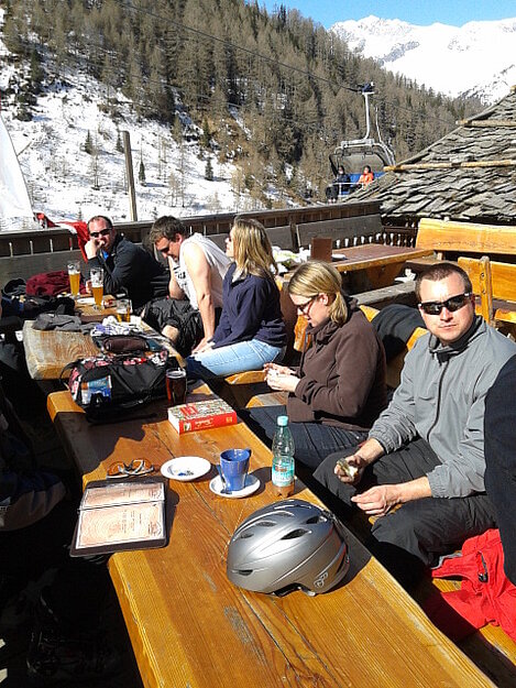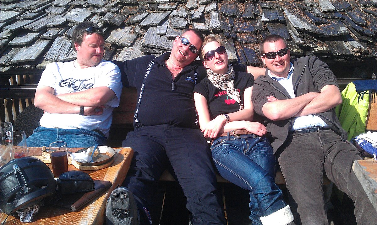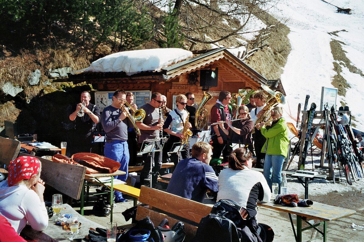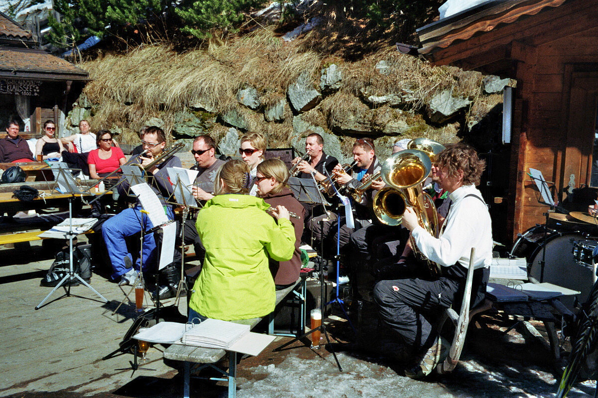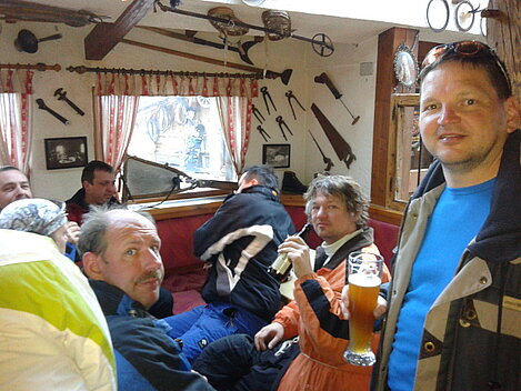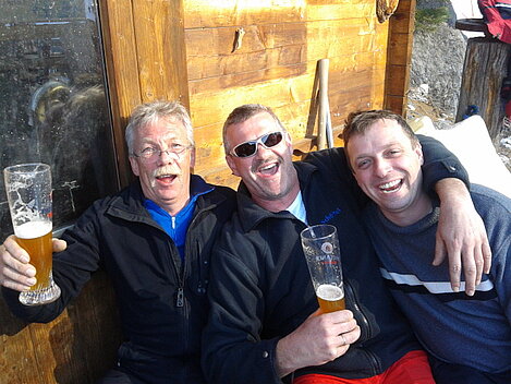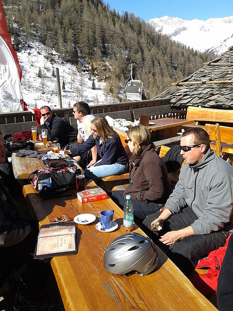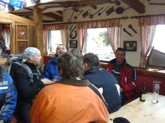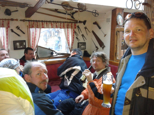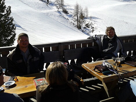 So kamen Skifahrer, Snowboarder und die mitgereisten Sonnenanbeter voll auf ihre Kosten. Und auch die Gäste der Speckalm. Denn erstmals brachten die Dorfmusikanten ihre Instrumente mit. Inklusive Trommel und Tuba spielte die Skifahrer-Besetzung auf der Sonnenterasse für die Gäste und den Hüttenwirt Sepp. Nach dem reichhaltigen Abendessen wurden die Abende gemeinsam gestaltet. Bei Tabu, Dart oder Kicker in der gemütlichen Stube oder einem Nickerchen auf der gemütlichen Ofenbank. Oder man (Frau) pflegte einfach die Wehwehchen - während allerlei Geschichten erzählt wurden.