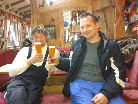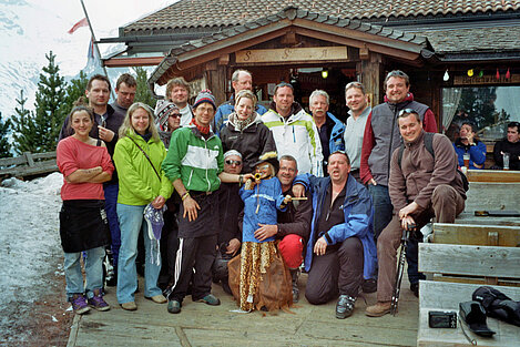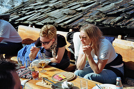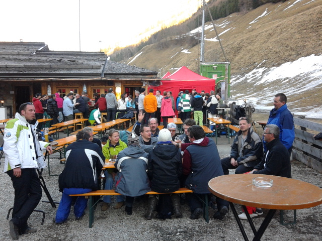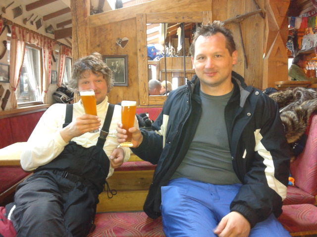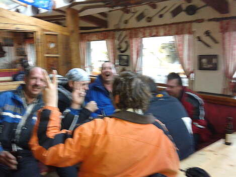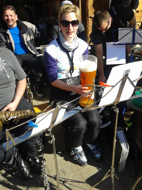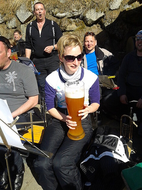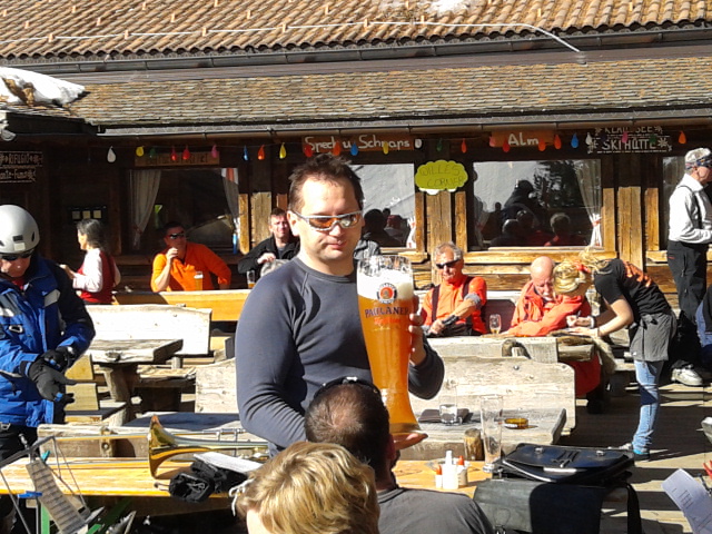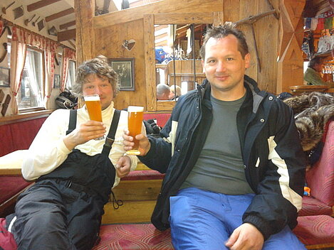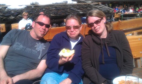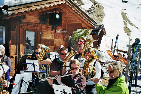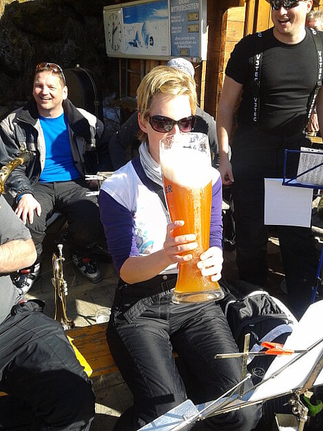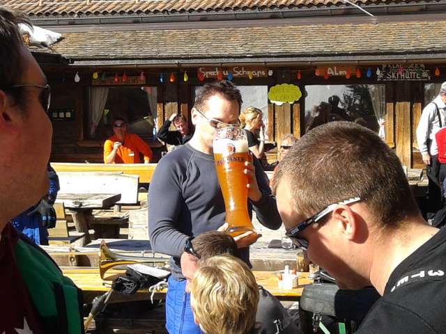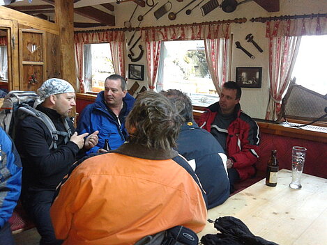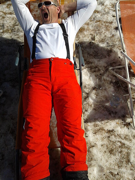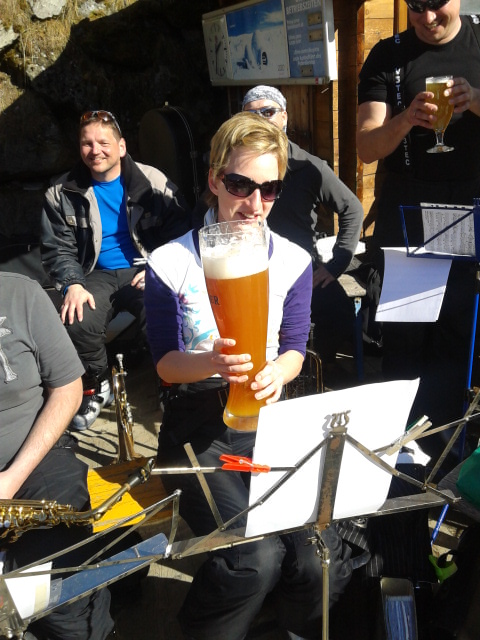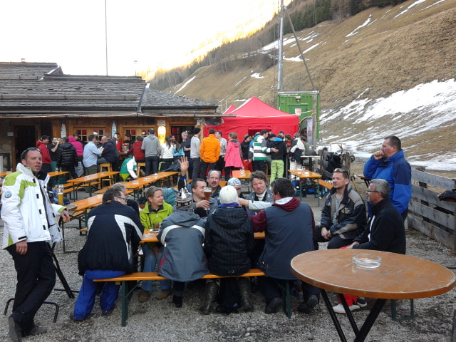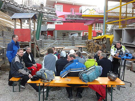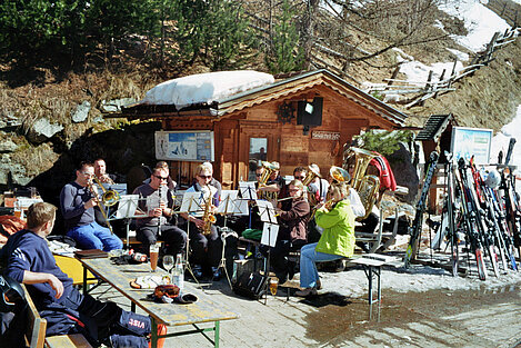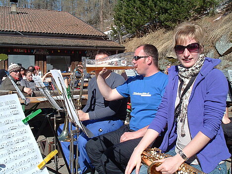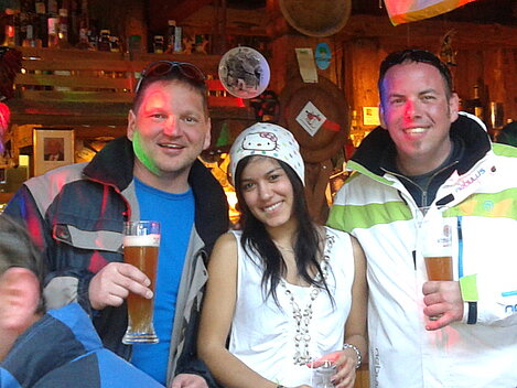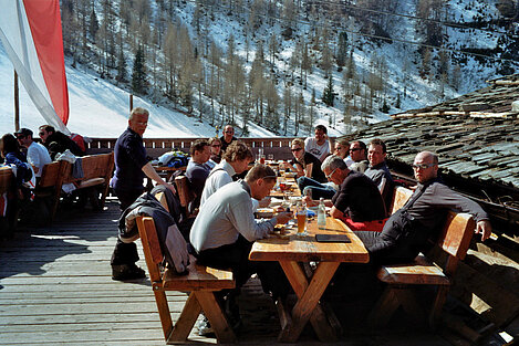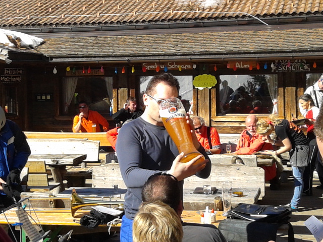 So kamen Skifahrer, Snowboarder und die mitgereisten Sonnenanbeter voll auf ihre Kosten. Und auch die Gäste der Speckalm. Denn erstmals brachten die Dorfmusikanten ihre Instrumente mit. Inklusive Trommel und Tuba spielte die Skifahrer-Besetzung auf der Sonnenterasse für die Gäste und den Hüttenwirt Sepp. Nach dem reichhaltigen Abendessen wurden die Abende gemeinsam gestaltet. Bei Tabu, Dart oder Kicker in der gemütlichen Stube oder einem Nickerchen auf der gemütlichen Ofenbank. Oder man (Frau) pflegte einfach die Wehwehchen - während allerlei Geschichten erzählt wurden.