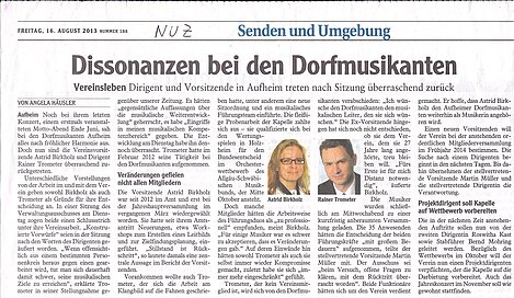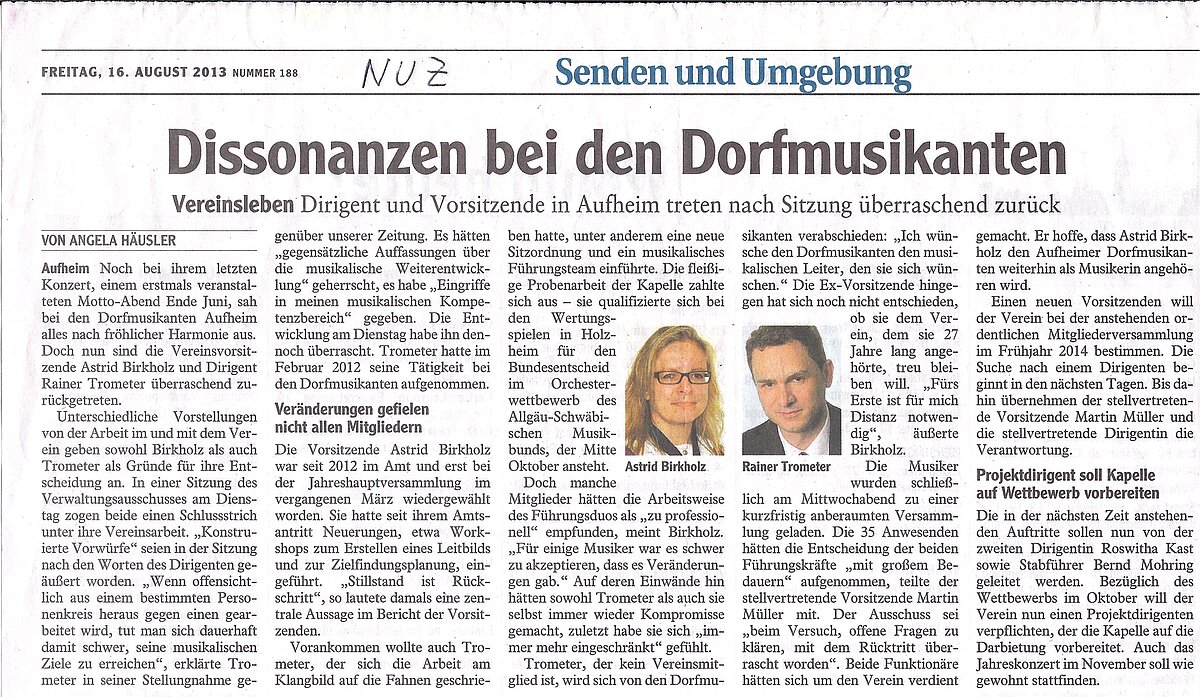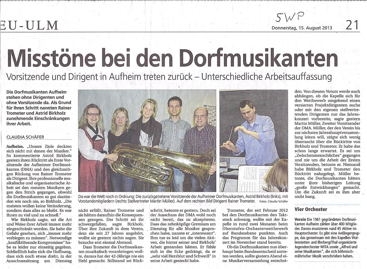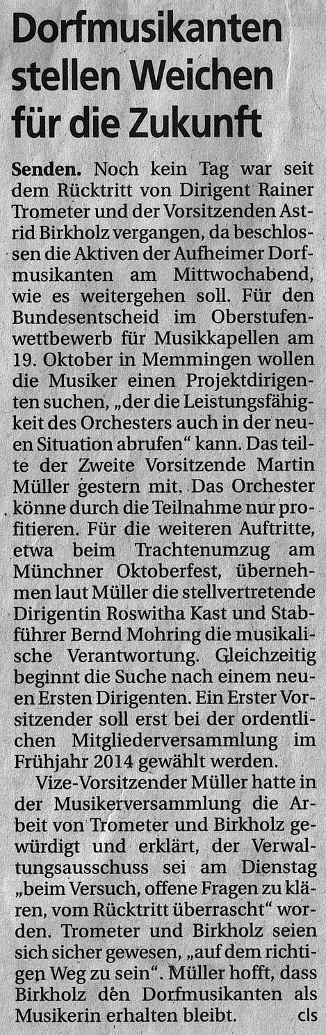 Überrascht wurde der Verwaltungsausschuss am Dienstag, 13. August 2013 während einer Sitzung, als in deren Verlauf die 1. Vorsitzende Astrid Birkholz zusammen mit dem 1. Dirigenten Rainer Trometer ihren Rücktritt erklärten. Beiden waren sich sicher „auf dem richtigen Weg zu sein". Um nicht an „Authentizität" zu verlieren beim Versuch die Mitglieder (und Musiker) auf diesem Weg mitzunehmen, hatten beide deckungsgleich erklärt, „steigen wir an diesem Punkt aus". Nach rund 17 bzw. 18 Monaten Verantwortung für den Verein an vorderster Stelle.