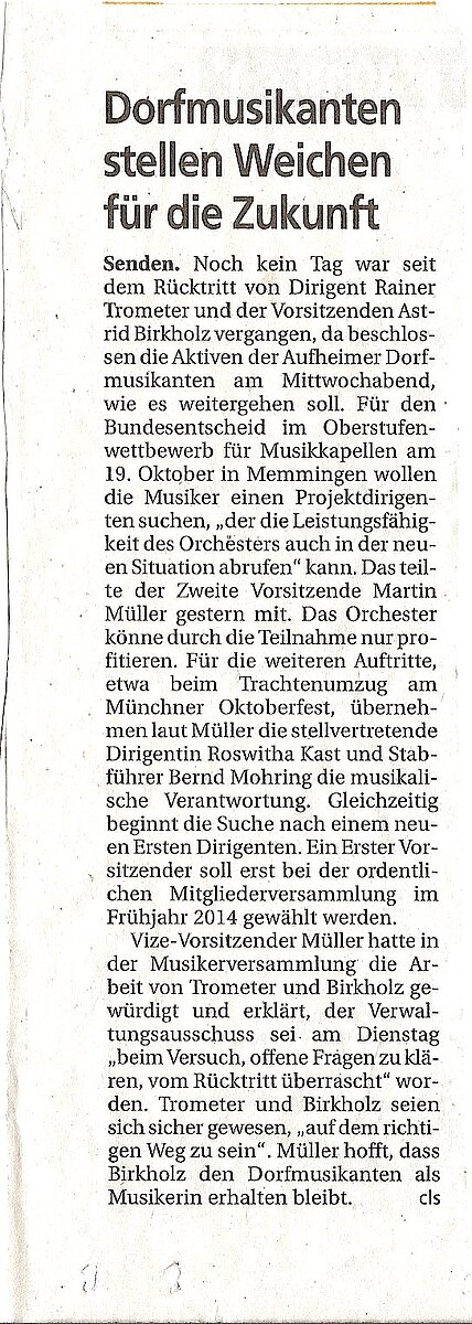 Einen neuen 1. Vorsitzende(n) suchen die Dorfmusikanten bei der anstehenden ordentlichen Mitgliederversammlung im Frühjahr 2014. Die Suche für einen Nachfolger(in) für das Amt des 1. Dirigenten beginnt in den nächsten Tagen. Bis dahin übernehmen der 2. Vorsitzende Martin Müller und die stellvertretende Dirigentin die Verantwortung.