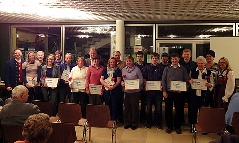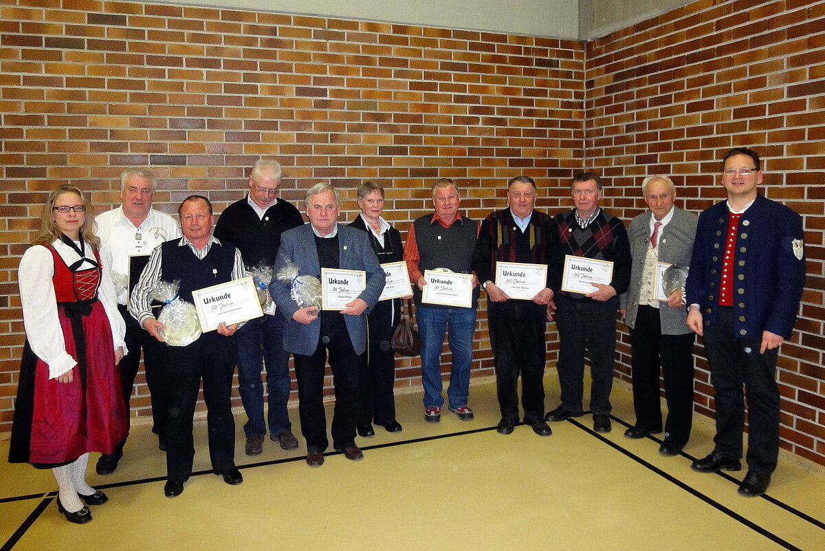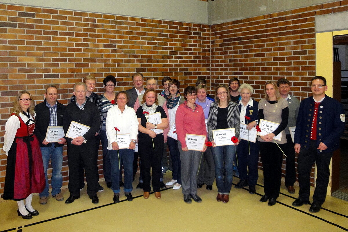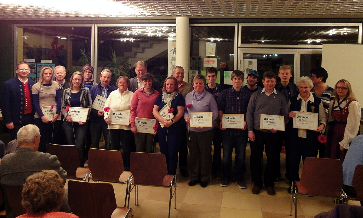 Für 15 jährige Mitgliedschaft wurden 36 Mitglieder geehrt: Karin Botzenhardt, Markus Botzenhardt, Michael Eggle, Andreas Görthofer, Anita Görthofer, Johannes Görthofer, Lidwina Görthofer, Manuel Görthofer, Michael Görthofer, Rosi Görthofer, Klara Hauke, Beate Heide, Erich Heide, Christoph Ibele, Karoline Junginger, Leo Junginger, Stefanie Junginger, Melanie Kreis, Anita Kügele, Bernd Kügele, Simon Kügele, Fabian Kügele, Ursula Laible, Andreas Mayerhofer, Gerhard Meyer, Bettina Ott, Meike Plettenberg, Irmi Sailer, Hubert Sailer, Michael Schmeller, Wolfgang Schmeller, Karin Schor, Vanessa Schor, Heinrich Zeller, Maria-Aloisia Zeller, Patrick Ziesel.