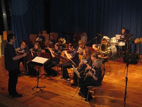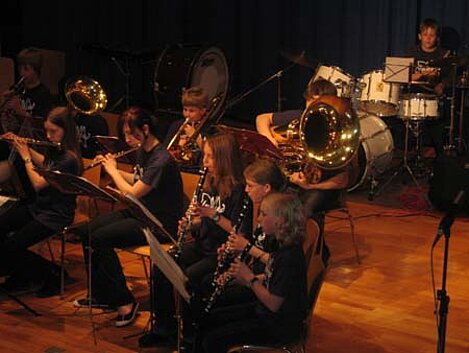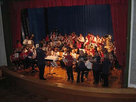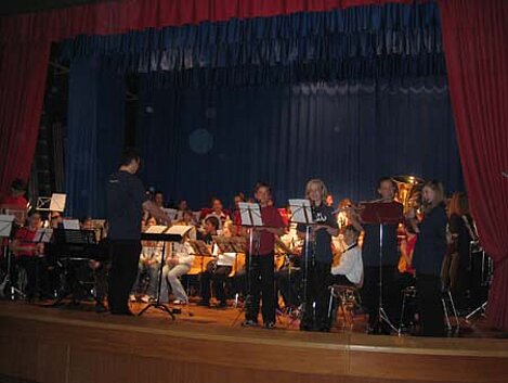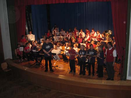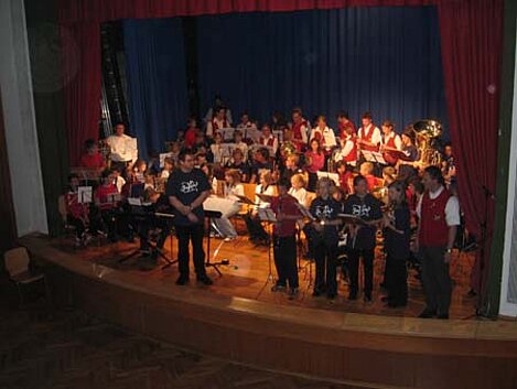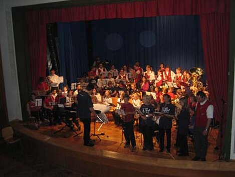 Der Höhepunkt des Abends, bei dem das Publikum in wahre Begeisterungsstürme ausbrach, war der gemeinsame Auftritt aller vier Jugendkapellen mit dem Stück "Guns'n'Cowboys".