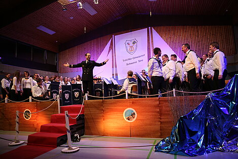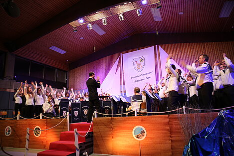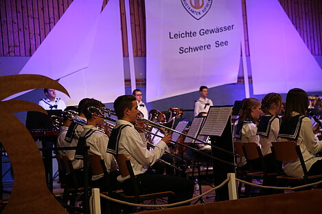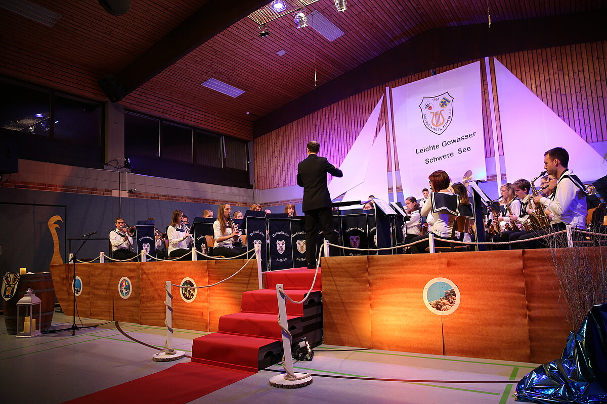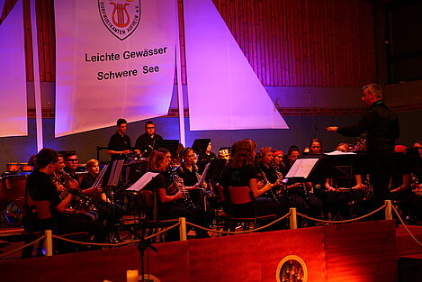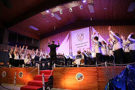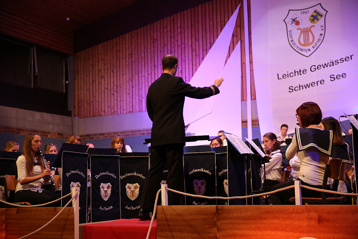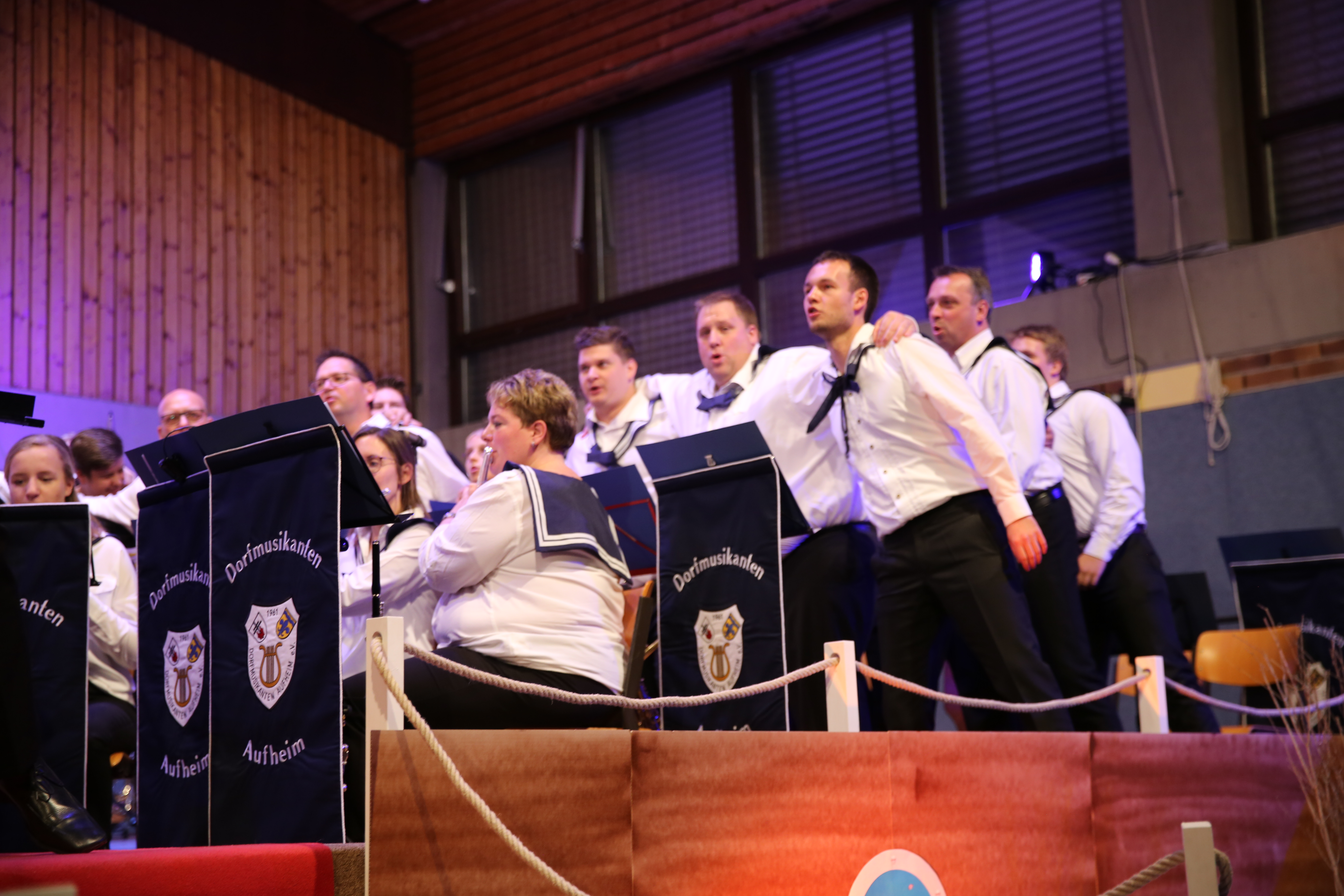 So endete die Fahrt „durch leichte Gewässer und schwere See“, so das Motto des Abends, in einer Hafenkneipe, mit dem Shanty „What Shall We Do with the Drunken Sailor“, für den sich die Musiker in einen stimmgewaltigen Chor mit nur minimaler Instrumentalbegleitung verwandelten. Schon zuvor beim Marinemarsch „Kameraden auf See“ hatten die Dorfmusikanten mit einer Gesangseinlage geglänzt.