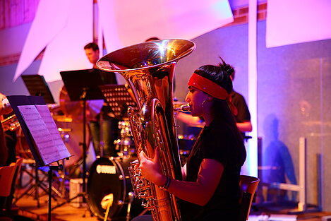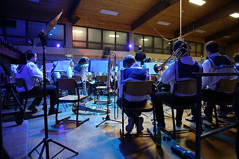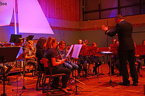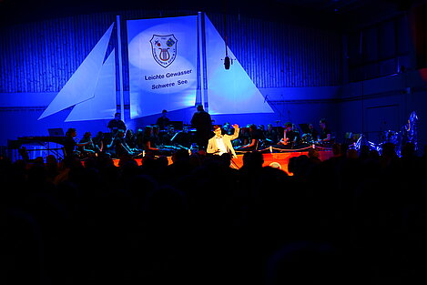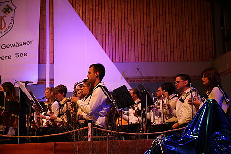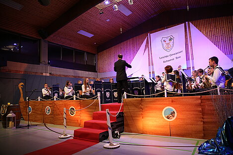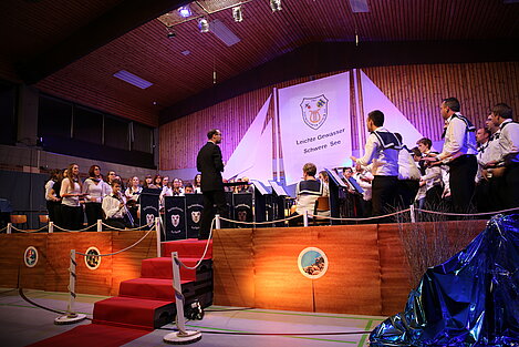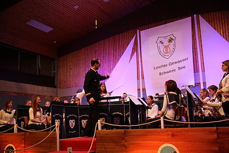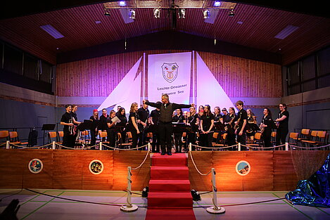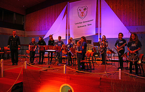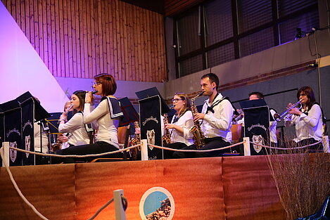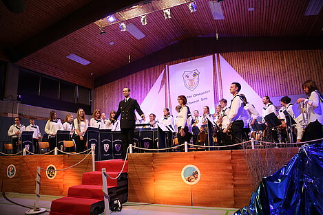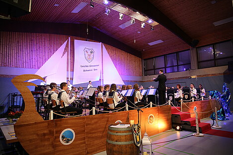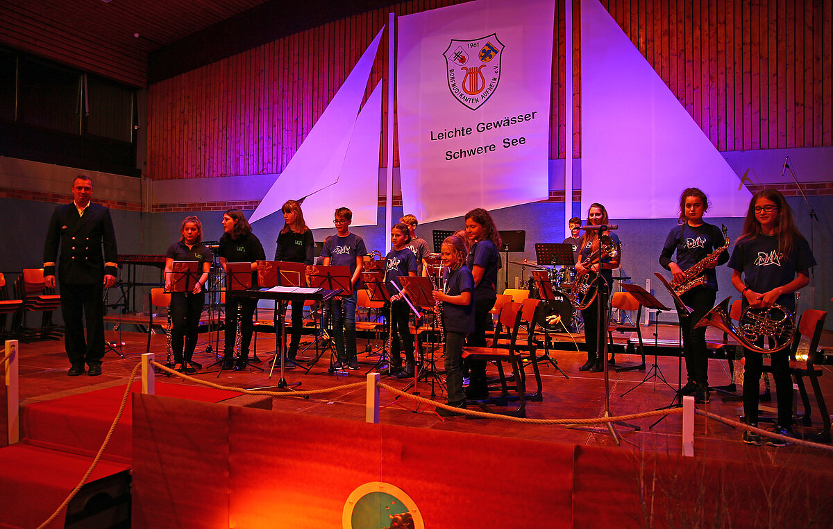 In See gestochen war zuerst die Anfängergruppe unter Dirigent Bernhard Ott, die ihr Potenzial als musikalische Zukunft der Dorfmusikanten wieder unter Beweis stellte. Mit dem gewohnten Schwung übernahm dann Rani Rezek mit seinem Jugendorchester Wita die Bühne, die fleißige Helfer für den Konzertabend in ein stattliches Schiff verwandelt hatten. Die Nachwuchsmusiker schlugen gekonnt den Bogen vom Strauß-Walzer „An der schönen blauen Donau“ zur Filmmusik des Blockbusters „Fluch der Karibik“.