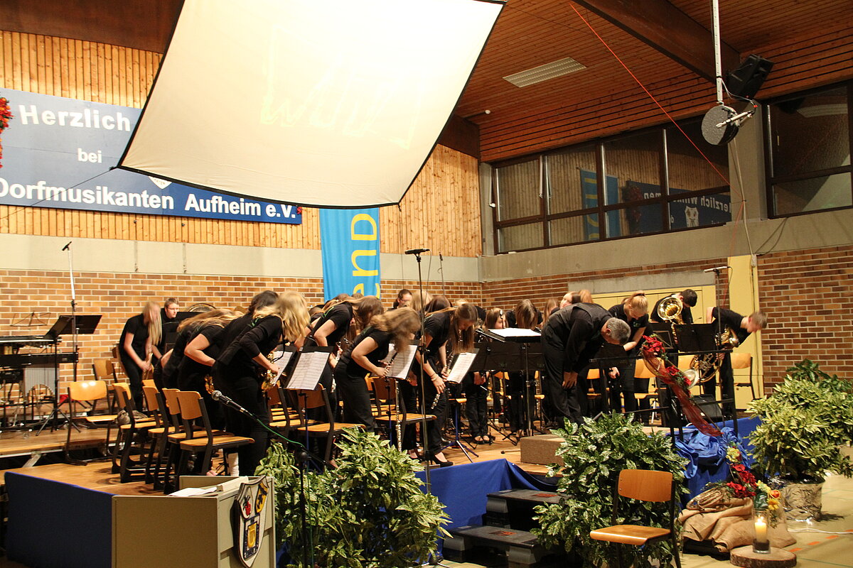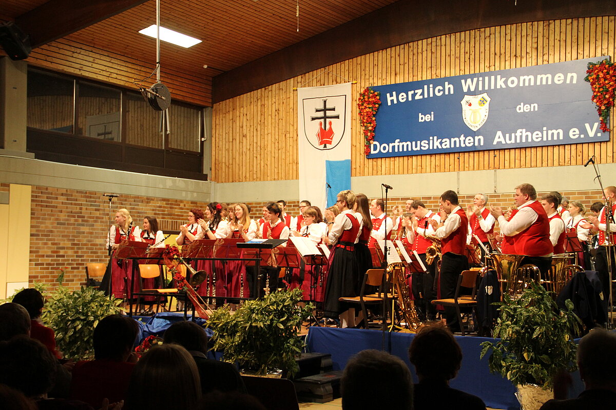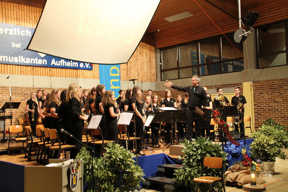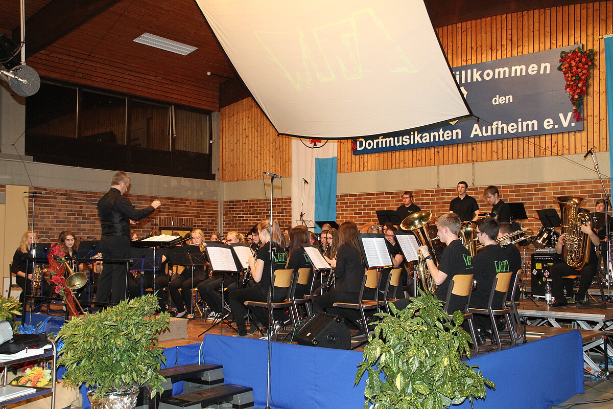 Nach der Pause eröffneten die Dorfmusikanten Aufheim unter Leitung von Andreas Glatzmaier den zweiten Teil des Konzerts. Mit gefühlvollen und tragenden Klängen der „Appalachian Overture“ entführte das Orchester in die Bergwelt der Nordamerikanischen Bergkette Appalachen mit ihren kristallklaren Seen und erhabenen Bergmassiven. Gefolgt von einer aufregenden Flussfahrt „Into the Raging River“. Dort umschiffte das Orchester alle musikalischen Stromschnellen und Wasserfälle gekonnt, um am Ende ins ruhige Wasser mit verträumten Klängen von Piccoloflöte und Trommel an Land zu kommen. Mit „La Principessa – die Prinzessin“ präsentierten die Dorfmusikanten das Pflichtstück des erfolgreichen Oberstufenwettbewerbs ebenso leichtfüßig und virtuos wie zuvor in Memmingen. Vor Ende des Konzert nahmen Dirigent und Musiker das Publikum auf eine musikalische „Reise um die Erde in 80 Tagen“ intoniert entsprechend der Idee des Romans von Jules Verne. Während das Orchester mit dem rhythmischen 7/8 Geräusch der Gleisschwellen per Zug reiste oder den Atlantik per Schiff überquerte und beim Ablegen die Nebelhörner, bestehend aus vier Tuben, erklangen, waren die Stationen wie beispielsweise England, der Orient mit Schlangenbeschwörern und Nordamerika mit Indianern auf ihren Pferden sowie der Weltstadt New York erleb- und spürbar.