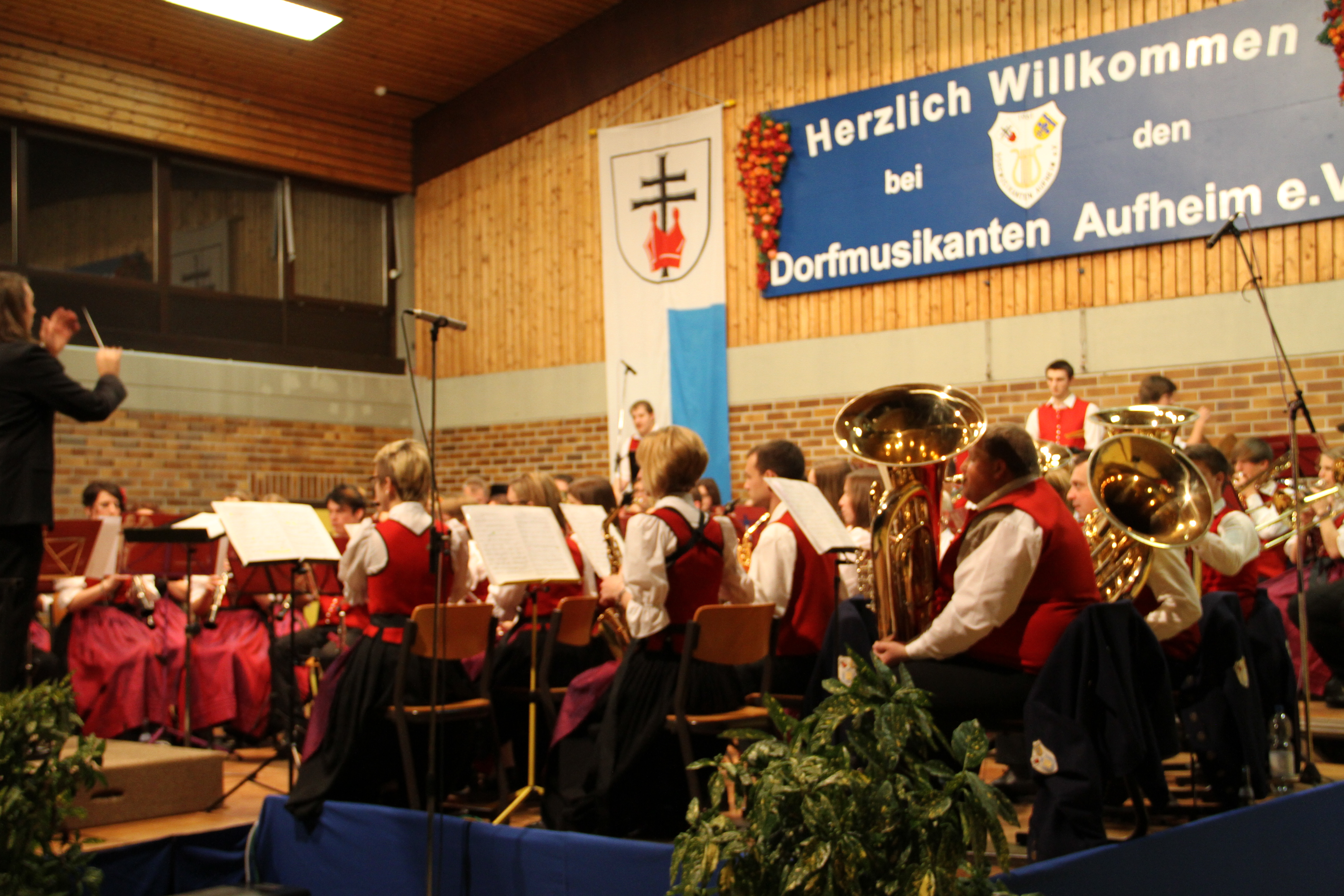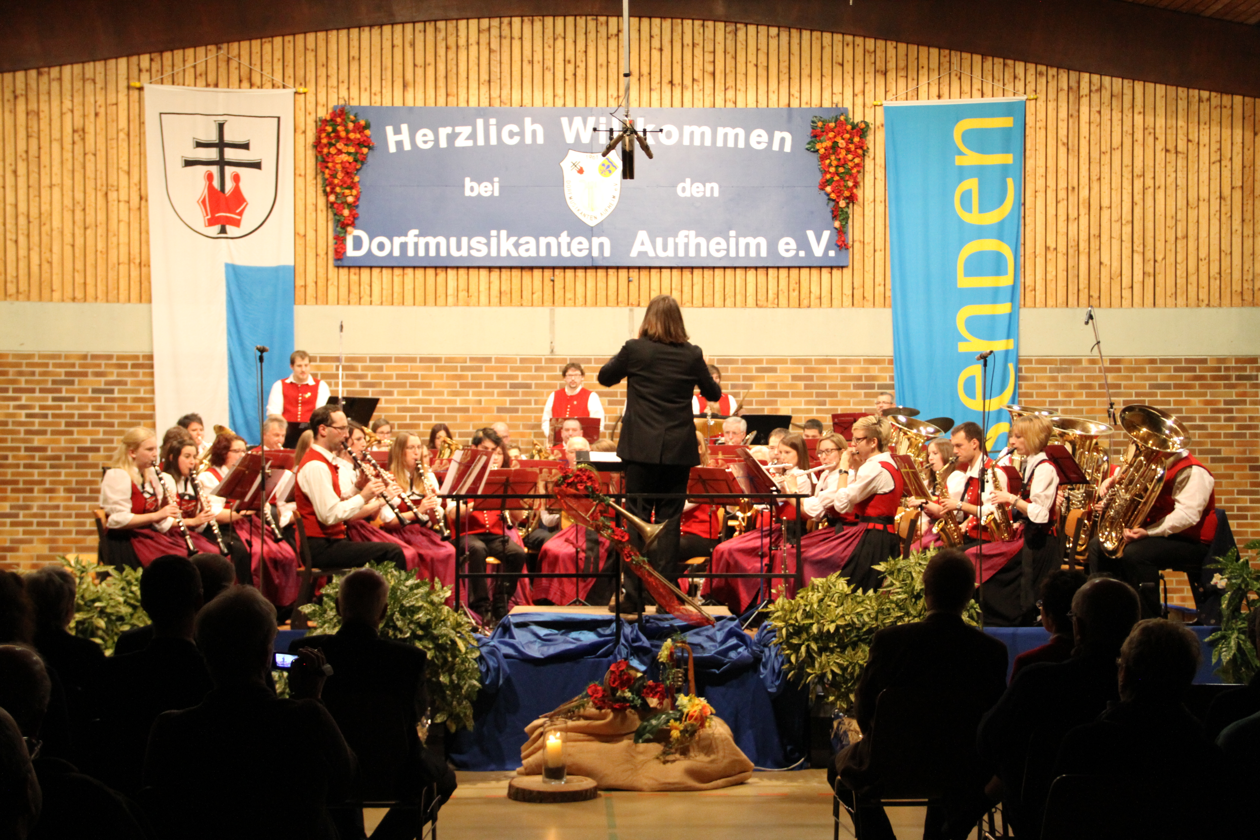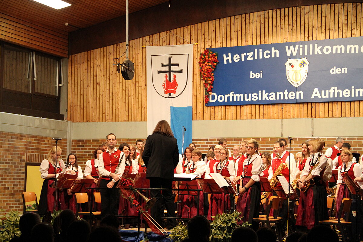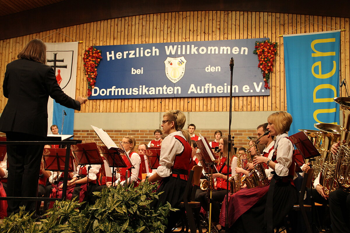 Nach der Pause eröffneten die Dorfmusikanten Aufheim unter Leitung von Andreas Glatzmaier den zweiten Teil des Konzerts. Mit gefühlvollen und tragenden Klängen der „Appalachian Overture“ entführte das Orchester in die Bergwelt der Nordamerikanischen Bergkette Appalachen mit ihren kristallklaren Seen und erhabenen Bergmassiven. Gefolgt von einer aufregenden Flussfahrt „Into the Raging River“. Dort umschiffte das Orchester alle musikalischen Stromschnellen und Wasserfälle gekonnt, um am Ende ins ruhige Wasser mit verträumten Klängen von Piccoloflöte und Trommel an Land zu kommen. Mit „La Principessa – die Prinzessin“ präsentierten die Dorfmusikanten das Pflichtstück des erfolgreichen Oberstufenwettbewerbs ebenso leichtfüßig und virtuos wie zuvor in Memmingen. Vor Ende des Konzert nahmen Dirigent und Musiker das Publikum auf eine musikalische „Reise um die Erde in 80 Tagen“ intoniert entsprechend der Idee des Romans von Jules Verne. Während das Orchester mit dem rhythmischen 7/8 Geräusch der Gleisschwellen per Zug reiste oder den Atlantik per Schiff überquerte und beim Ablegen die Nebelhörner, bestehend aus vier Tuben, erklangen, waren die Stationen wie beispielsweise England, der Orient mit Schlangenbeschwörern und Nordamerika mit Indianern auf ihren Pferden sowie der Weltstadt New York erleb- und spürbar.