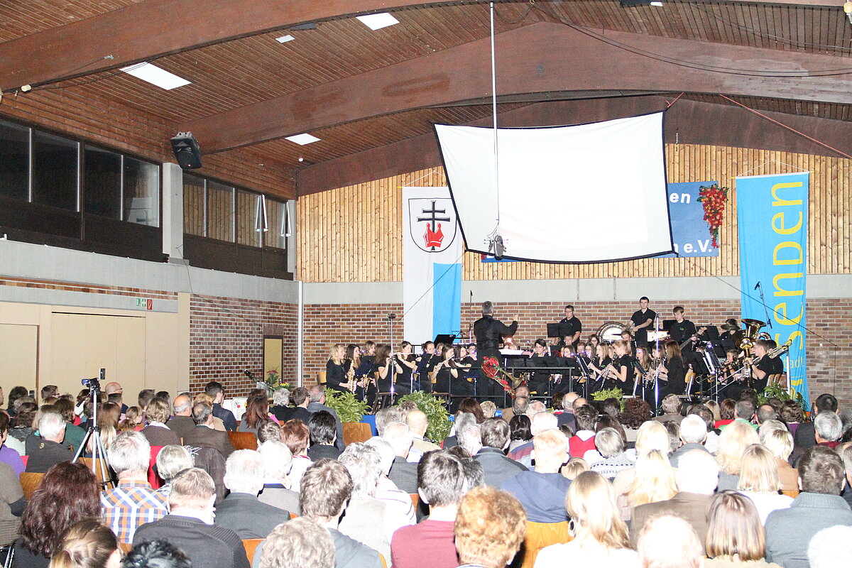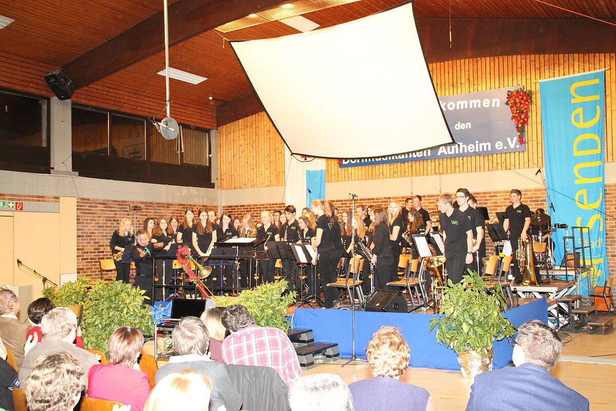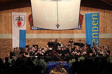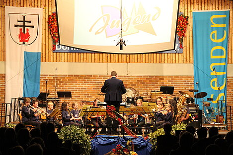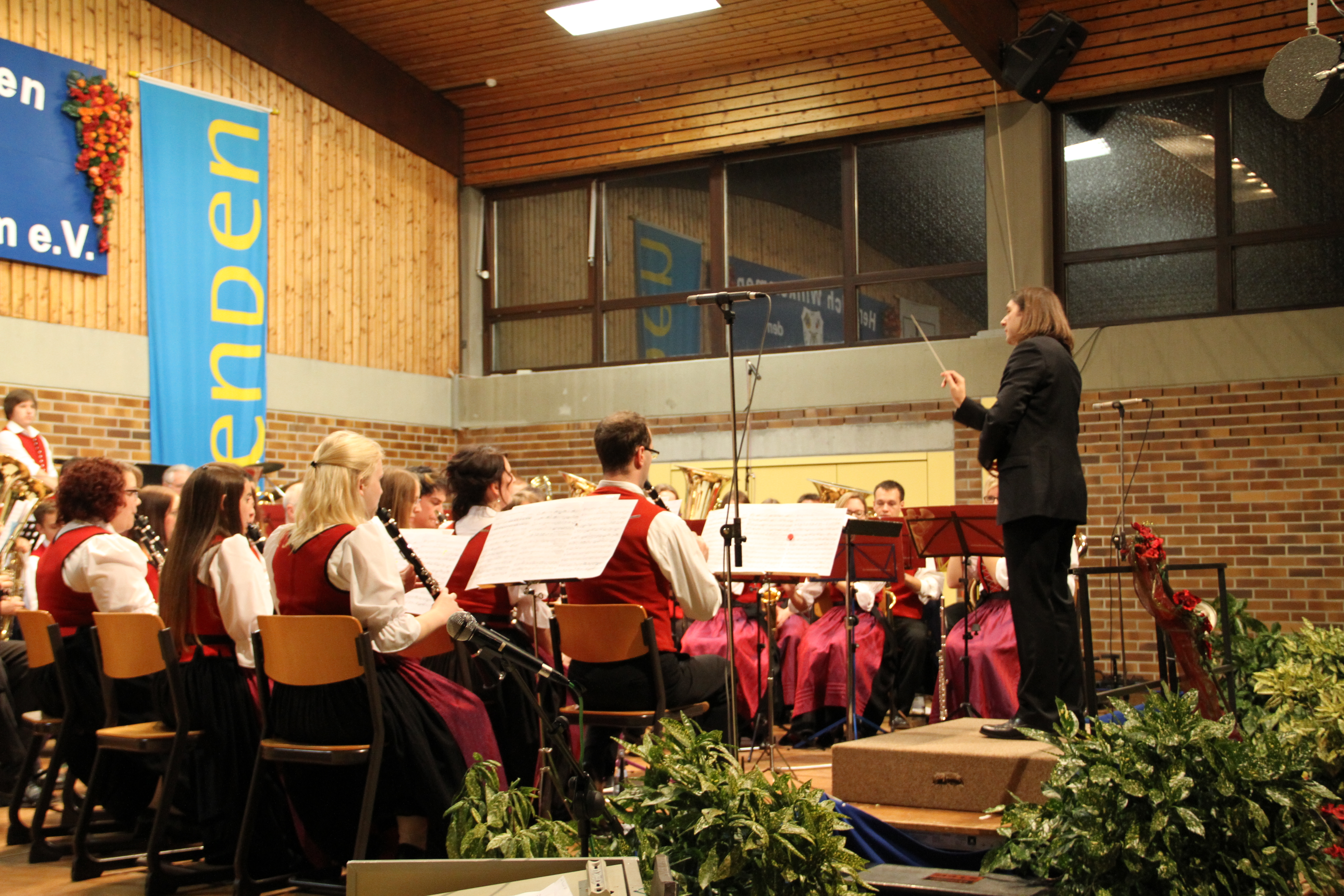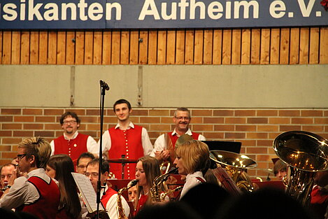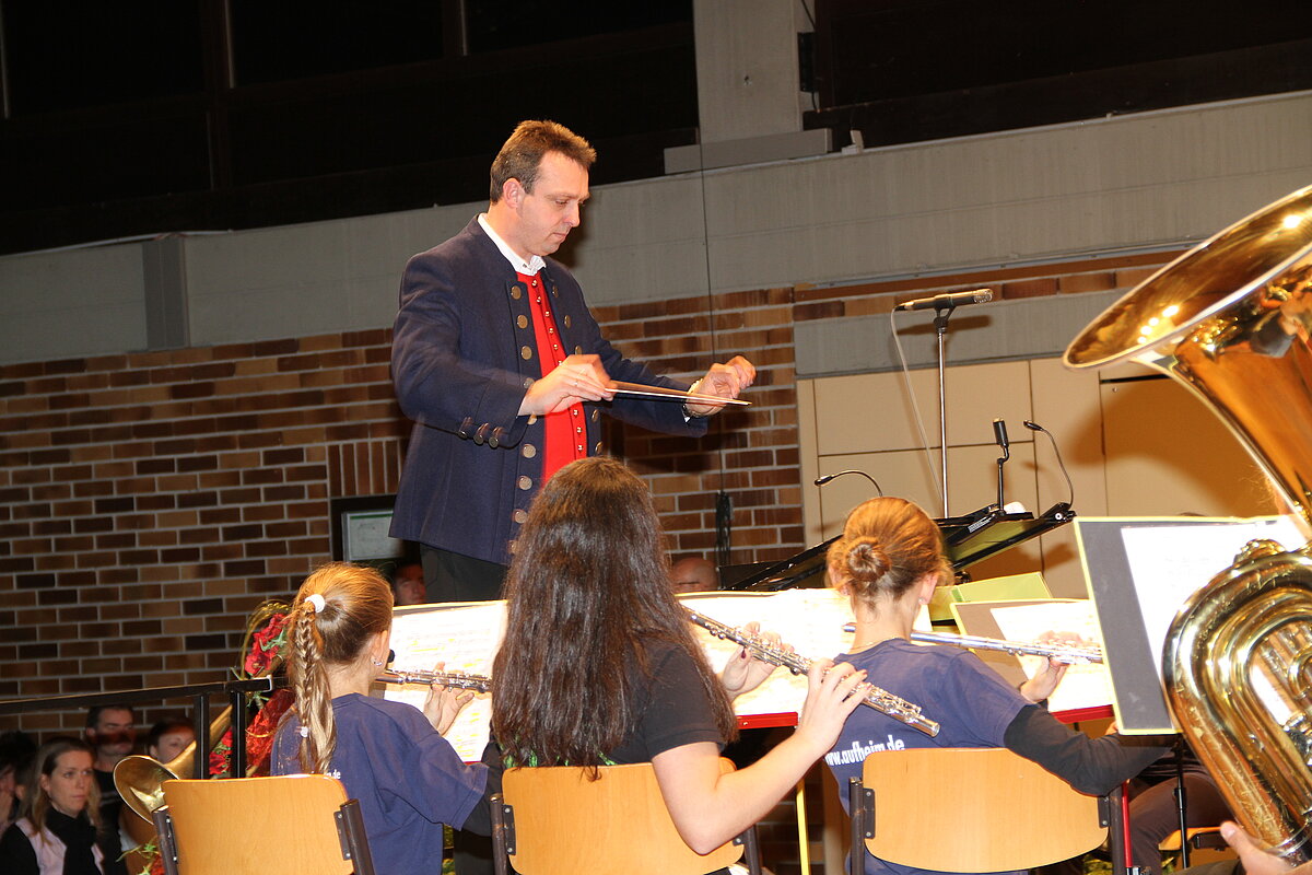 Nach der Pause eröffneten die Dorfmusikanten Aufheim unter Leitung von Andreas Glatzmaier den zweiten Teil des Konzerts. Mit gefühlvollen und tragenden Klängen der „Appalachian Overture“ entführte das Orchester in die Bergwelt der Nordamerikanischen Bergkette Appalachen mit ihren kristallklaren Seen und erhabenen Bergmassiven. Gefolgt von einer aufregenden Flussfahrt „Into the Raging River“. Dort umschiffte das Orchester alle musikalischen Stromschnellen und Wasserfälle gekonnt, um am Ende ins ruhige Wasser mit verträumten Klängen von Piccoloflöte und Trommel an Land zu kommen. Mit „La Principessa – die Prinzessin“ präsentierten die Dorfmusikanten das Pflichtstück des erfolgreichen Oberstufenwettbewerbs ebenso leichtfüßig und virtuos wie zuvor in Memmingen. Vor Ende des Konzert nahmen Dirigent und Musiker das Publikum auf eine musikalische „Reise um die Erde in 80 Tagen“ intoniert entsprechend der Idee des Romans von Jules Verne. Während das Orchester mit dem rhythmischen 7/8 Geräusch der Gleisschwellen per Zug reiste oder den Atlantik per Schiff überquerte und beim Ablegen die Nebelhörner, bestehend aus vier Tuben, erklangen, waren die Stationen wie beispielsweise England, der Orient mit Schlangenbeschwörern und Nordamerika mit Indianern auf ihren Pferden sowie der Weltstadt New York erleb- und spürbar.
