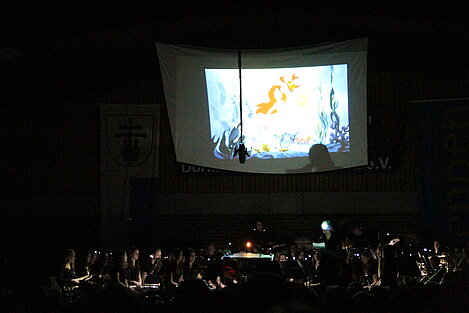 Beim Auftritt des Jugendorchesters WITA wurde es zunächst Dunkel. Ganz wie im Kino. Auf der Leinwand bzw. darunter klang die Filmmusik zu bekannten Filmen von Walt Disney. Gefühlvoll intonierten sie die Geschichte von Arielle, die Meerjungfrau unter Leitung des 2. Dirigenten Alexander Menth. Mit Dirigent Rani Rezek spielte die WITA gekonnt die Musik aus dem Trickfilm „Fantasia“, bei der es dem Zuhörer nicht schwer viel, sich auch mal ein leichtfüßiges, tanzendes Nilpferd-Ballett vorzustellen. Die pompöse Interpretation von „Pirates of the Caribbean“ versetzte das Publikum mitten in die fantastischen Auseinandersetzung um den Piraten Captain Jack Sparrow, der im Originalfilm von Johnny Depp dargestellt wurde.