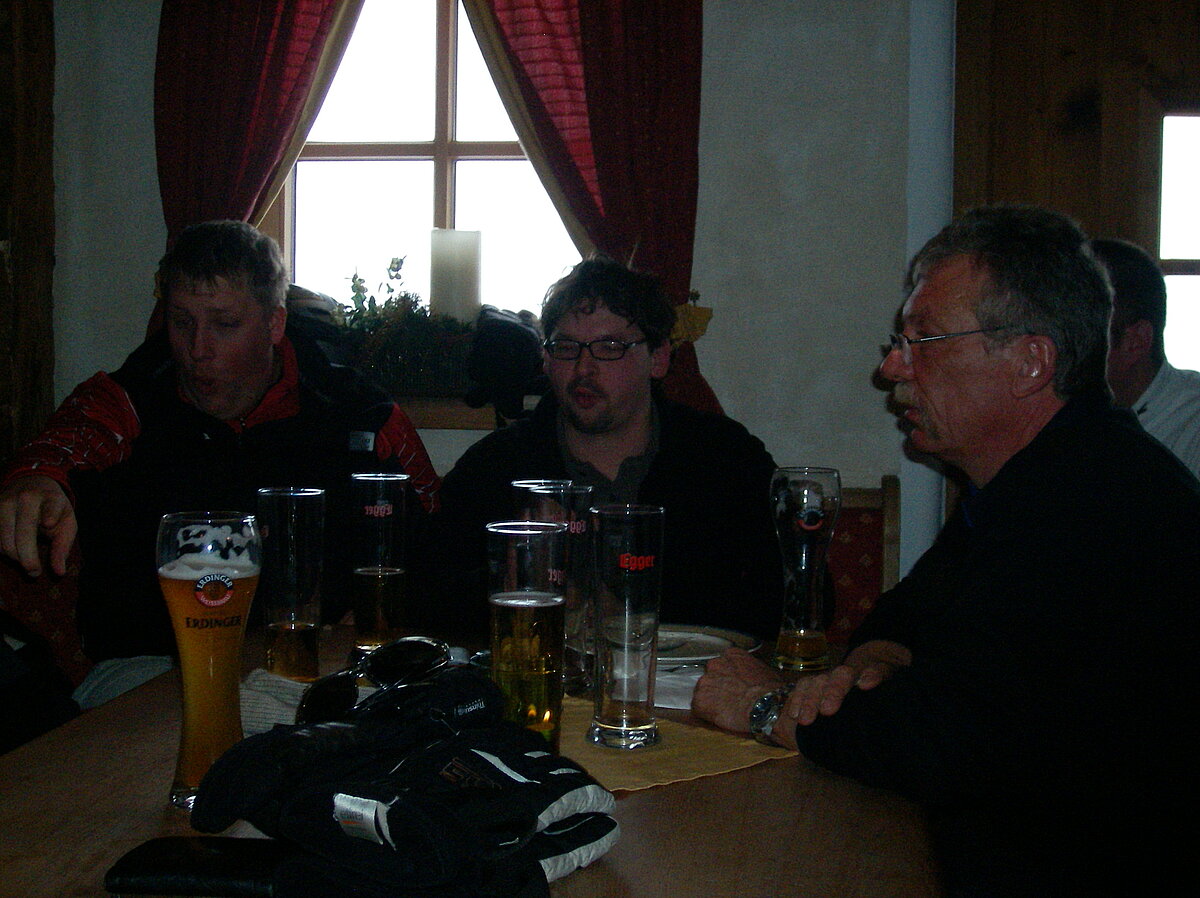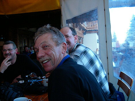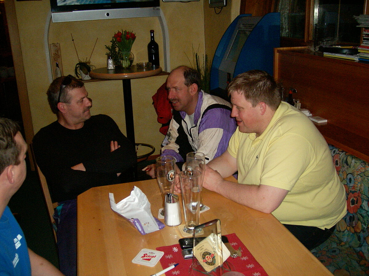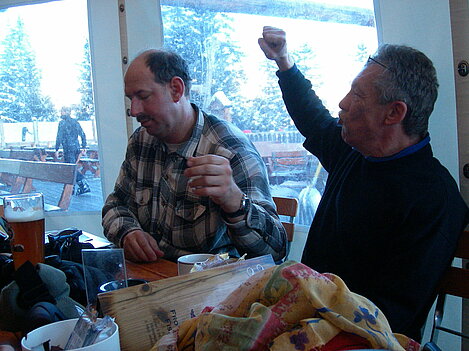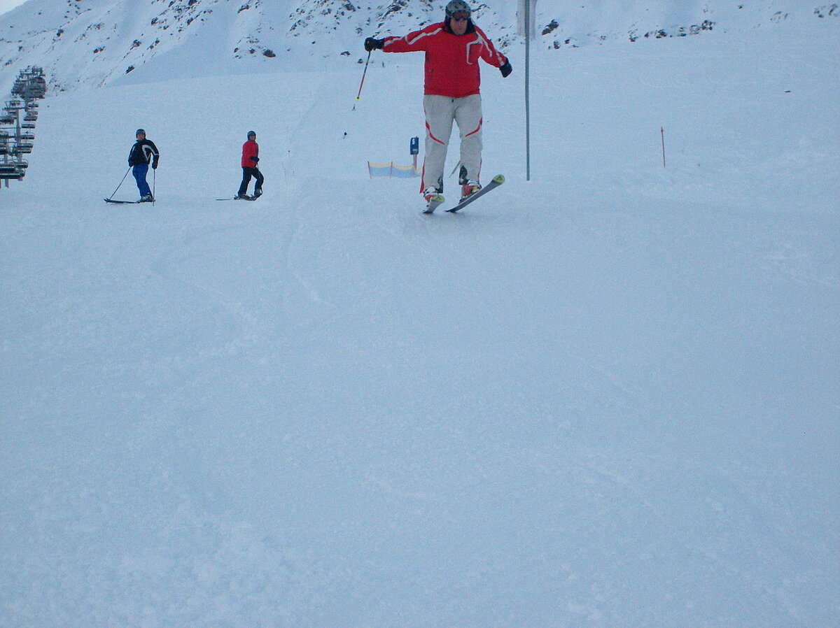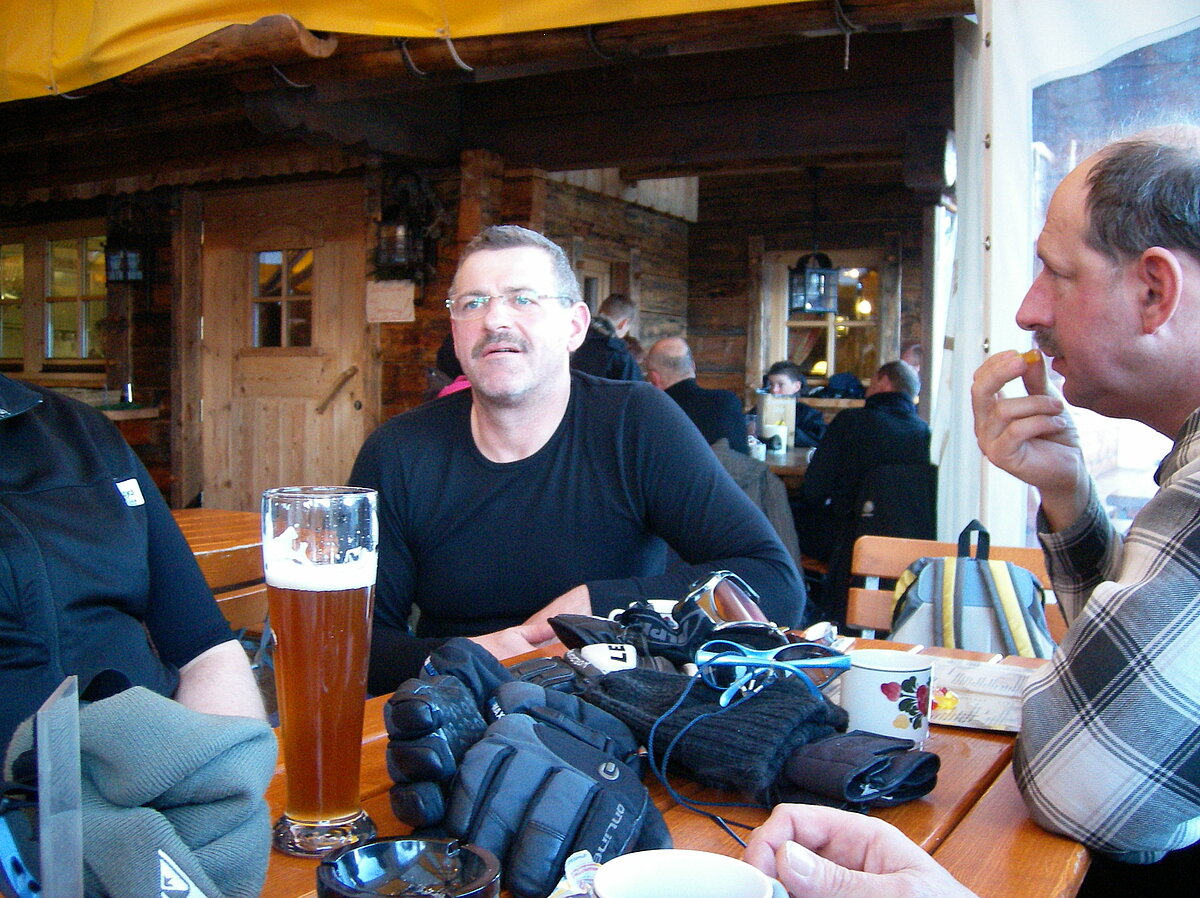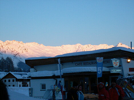 Stürmisch geht’s heut los. Und die Nordseiten der Hänge sind gesperrt. Einige hätten die Gondel bei soviel Bewegung eh nicht nehmen können. Zusammen mit Urlaubern aus ganz Europa drängen wir uns über die eingeengten Pisten. Gegen Nachmittag bekommen wir nochmals Zuwachs. Zwei Skifahrer und zwei Rodelfreunde – extra aus Aufheim nachgereist - schließen sich unserer Gruppe an. Wir sind erfreut. Abends gibt’s Live-Kino der besonderen Art. Welche anreisenden Gäste machen am schnellsten die Schneeketten an der Passstraße drauf?