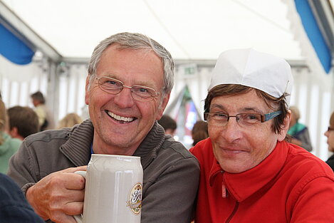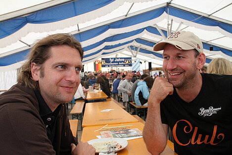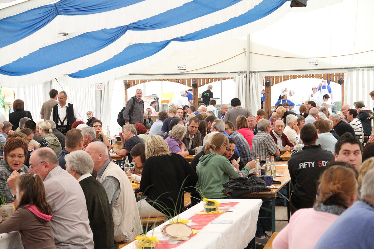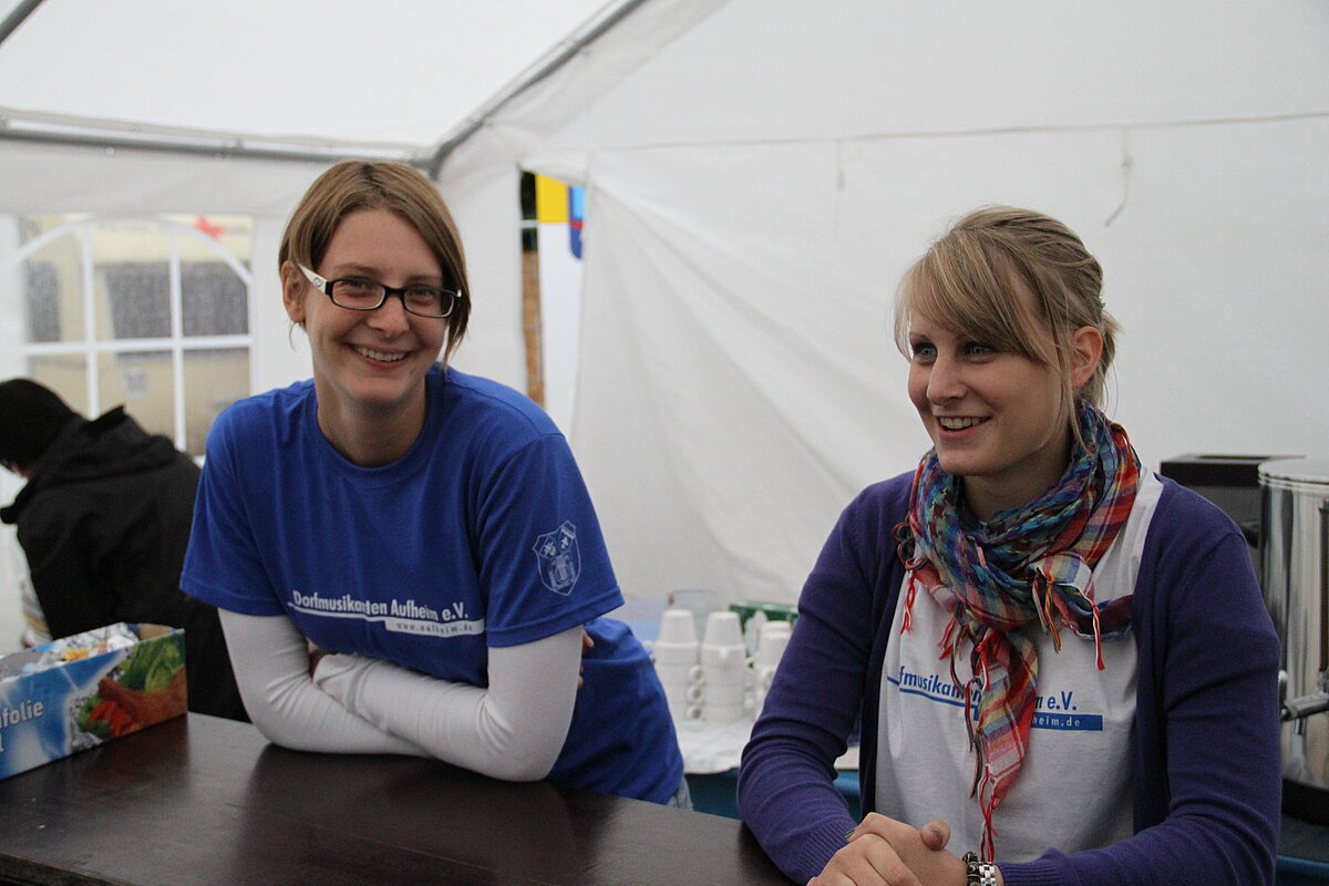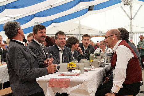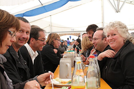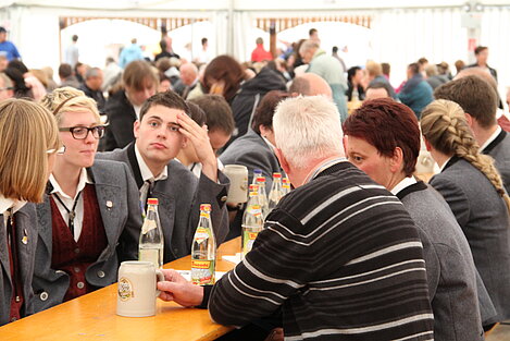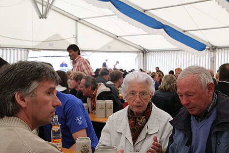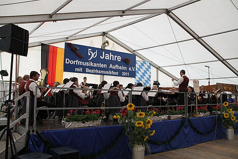 Mit Beginn des anschließenden Frühschoppens durch die Harmonia waren trotzdem zahlreiche Gäste ins wärmere und trockene Festzelt gekommen. Bei leckeren Speisen aus unserer Küche sowie Kaffee und Kuchen trafen sich zahlreiche Freunde und Ehemalige der Dorfmusikanten. Auch und besonders aus den Anfangsjahren der Dorfmusikanten. Es freut uns, dass so viele Bekannte am Ehrentisch sowie in den Reihen des Zelts nach Aufheim fanden und jeder ein kleines Wiedersehen feiern konnte.