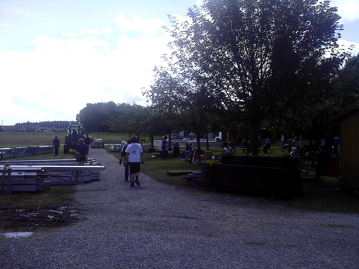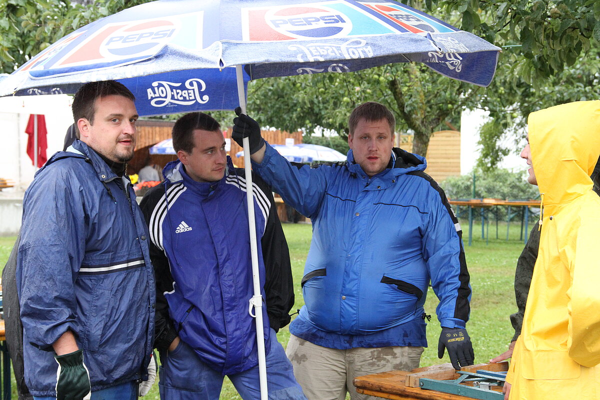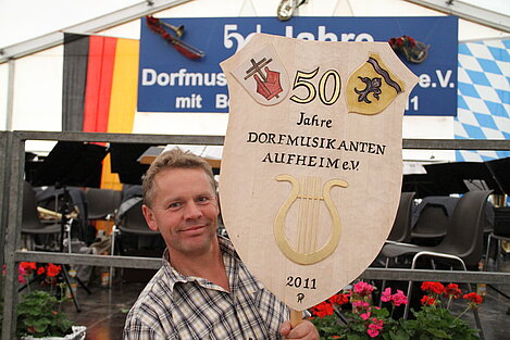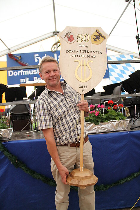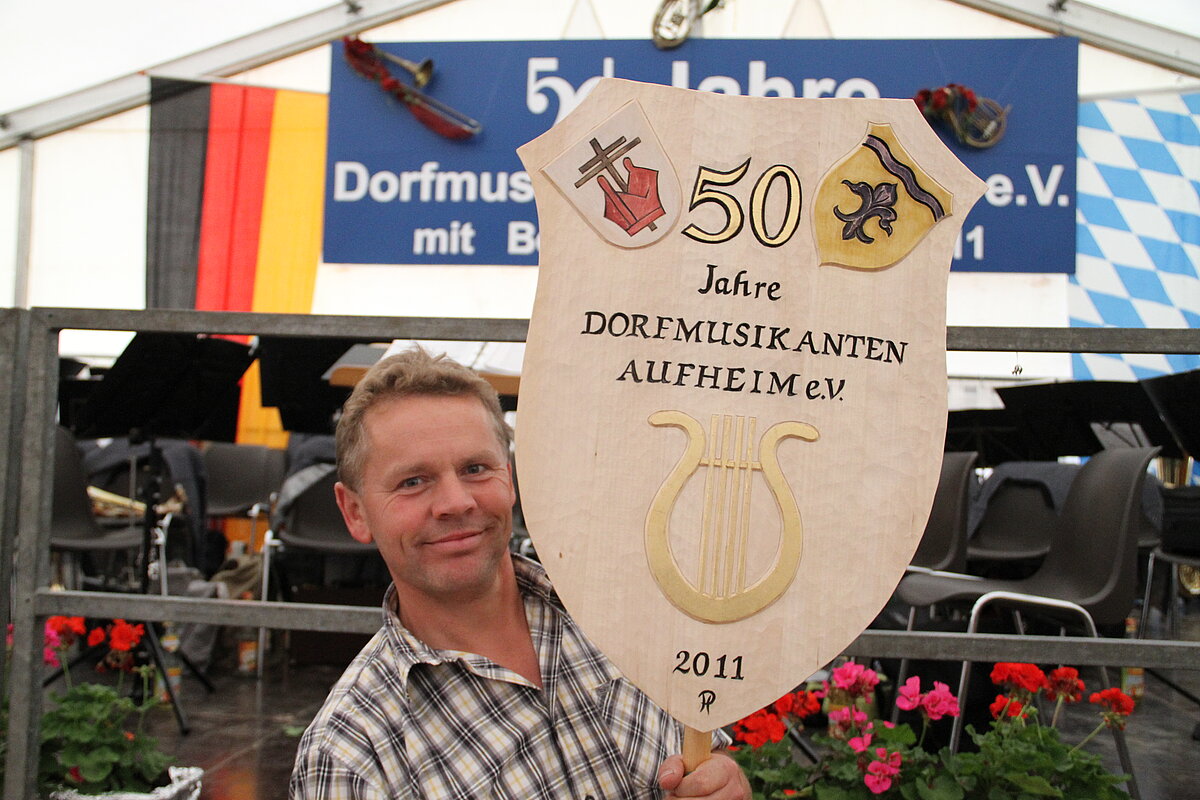 Hubert Pömmer, der Schöpfer und Künstler unseres Maskottchens, dem lebensgroßen Holztubisten "Lothar", war aus Österreich ebenfalls nach Aufheim gekommen und überreichte ein besonderes Jubiläumsgeschenk. Das geschnitzte Jubiläums-Holzwappen mit goldener 50 werden wir spätestens beim Trachten- und Schützenumzug beim Oktoberfest München im Herbst präsentieren. Immer noch bei Dauerregen spielte die Sommertourband Vöhringen zum Festausklang auf. Gegen 21.30 Uhr war die einmalige und unvergessliche Geburtstagsfeier unseres Vereins vorbei.