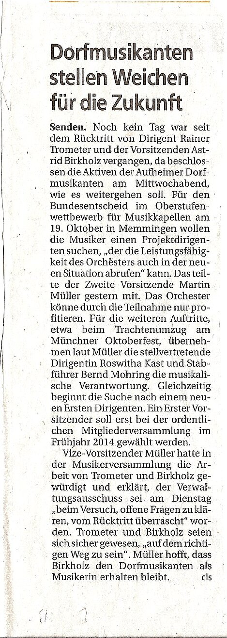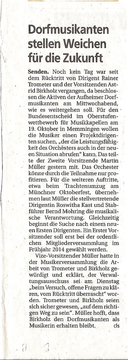 Überrascht wurde der Verwaltungsausschuss am Dienstag, 13. August 2013 während einer Sitzung, als in deren Verlauf die 1. Vorsitzende Astrid Birkholz zusammen mit dem 1. Dirigenten Rainer Trometer ihren Rücktritt erklärten. Beiden waren sich sicher „auf dem richtigen Weg zu sein". Um nicht an „Authentizität" zu verlieren beim Versuch die Mitglieder (und Musiker) auf diesem Weg mitzunehmen, hatten beide deckungsgleich erklärt, „steigen wir an diesem Punkt aus". Nach rund 17 bzw. 18 Monaten Verantwortung für den Verein an vorderster Stelle.
