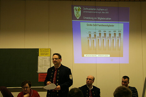 Ganz im Sinne des Vorsitzenden Thomas Mohring, der im Verlauf des Berichts die Wichtigkeit der Jugendarbeit mit dem geflügelten Wort "Jugend ist Zukunft" herausstellte. Mit seinem Hauptorchester Dorfmusikanten Aufheim, der Anfängergruppe, dem Jugendorchester Jungbläser und der Gruppe „Alfred und seine Musikanten“ sowie der großen Zahl Freunde und fördernder Mitglieder erlebt der Verein glücklicherweise jeden Tag neu seine Leistungsfähigkeit. Er bedankte sich für die zuverlässige und unkomplizierte Unterstützung während seiner häufigen Abwesenheit. Durch Gemeinsinn und Harmonie schafft es jeder seine Freizeit gerne als „Dorfmusikant“ zu verbringen. Die Mitgliederzahlen sind seit Jahren stabil mit leichtem Aufwärtstrend, die Anzahl Auftritte und Aktivitäten im Verein füllten in 2008 insgesamt 3 Seiten. In der laufenden Präsentation wurden zahlreiche Bilder gezeigt.