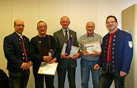 Als nächster Tagesordnungspunkt wurden langjährige Mitglieder für ihre Treue zum Verein und ihre Unterstützung geehrt. Für 25 jährige Mitgliedschaft wurden Herr August Marahrens, Herr Roman Bilmayer und Herr Karl Schmidt von den Vorsitzenden Thomas Mohring und Martin Müller geehrt und bekamen eine Urkunde zusammen mit der silbernen Ehrennadel der Dorfmusikanten überreicht. Thomas Mohring betonte die Wichtigkeit fördernder Mitglieder für den Verein. Sie seien das Fundament, auf dem der Verein baut. Für 15 jährige Treue wurden außerdem Herr Alexander Grasser und Herr Josef Schauer mit der bronzenen Ehrennadel der Dorfmusikanten bedacht.