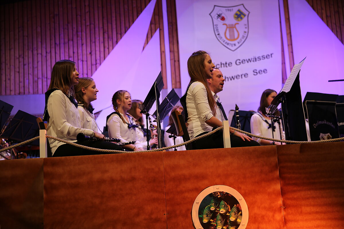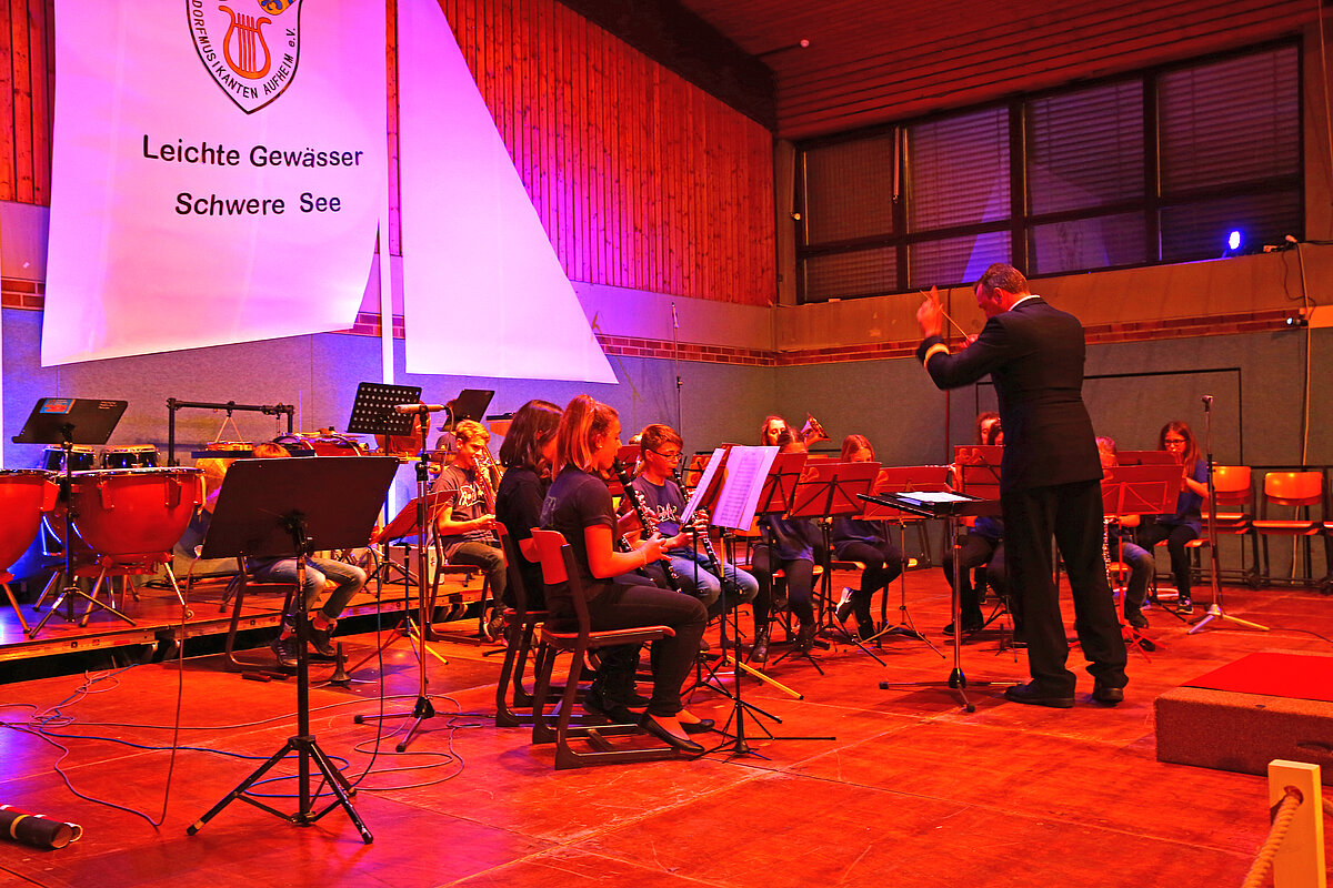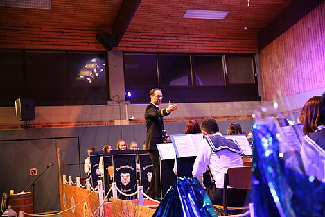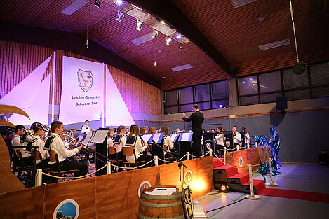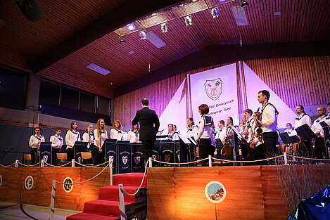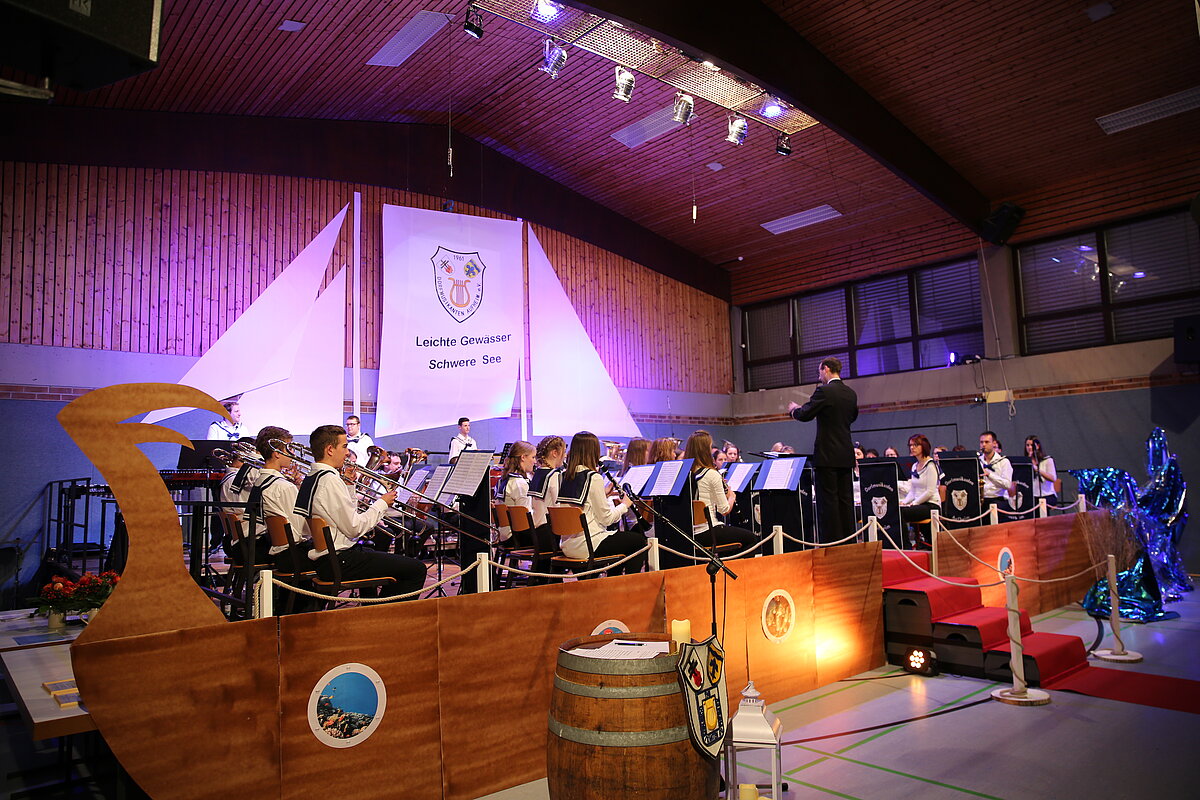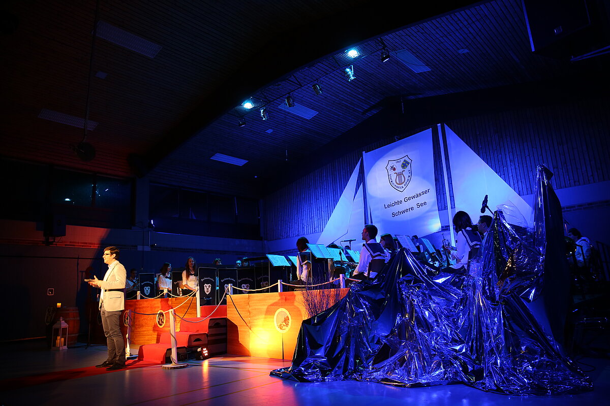 In See gestochen war zuerst die Anfängergruppe unter Dirigent Bernhard Ott, die ihr Potenzial als musikalische Zukunft der Dorfmusikanten wieder unter Beweis stellte. Mit dem gewohnten Schwung übernahm dann Rani Rezek mit seinem Jugendorchester Wita die Bühne, die fleißige Helfer für den Konzertabend in ein stattliches Schiff verwandelt hatten. Die Nachwuchsmusiker schlugen gekonnt den Bogen vom Strauß-Walzer „An der schönen blauen Donau“ zur Filmmusik des Blockbusters „Fluch der Karibik“.