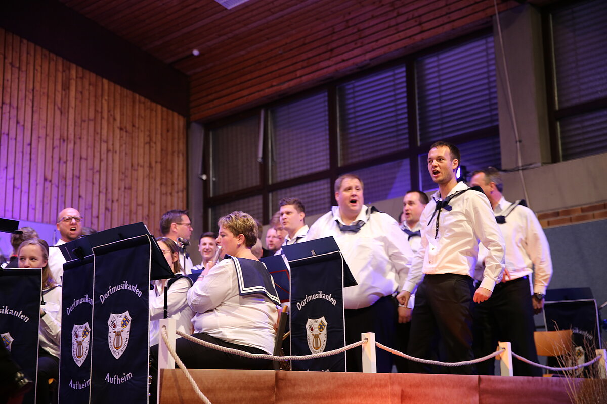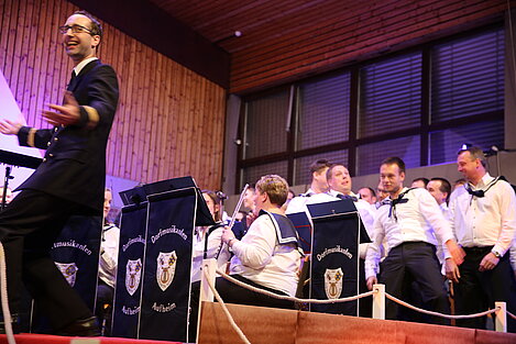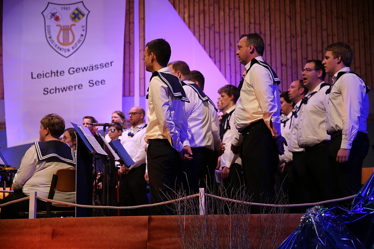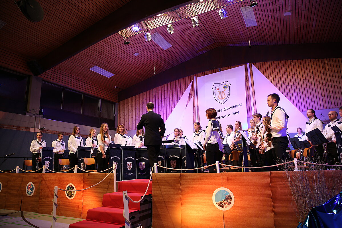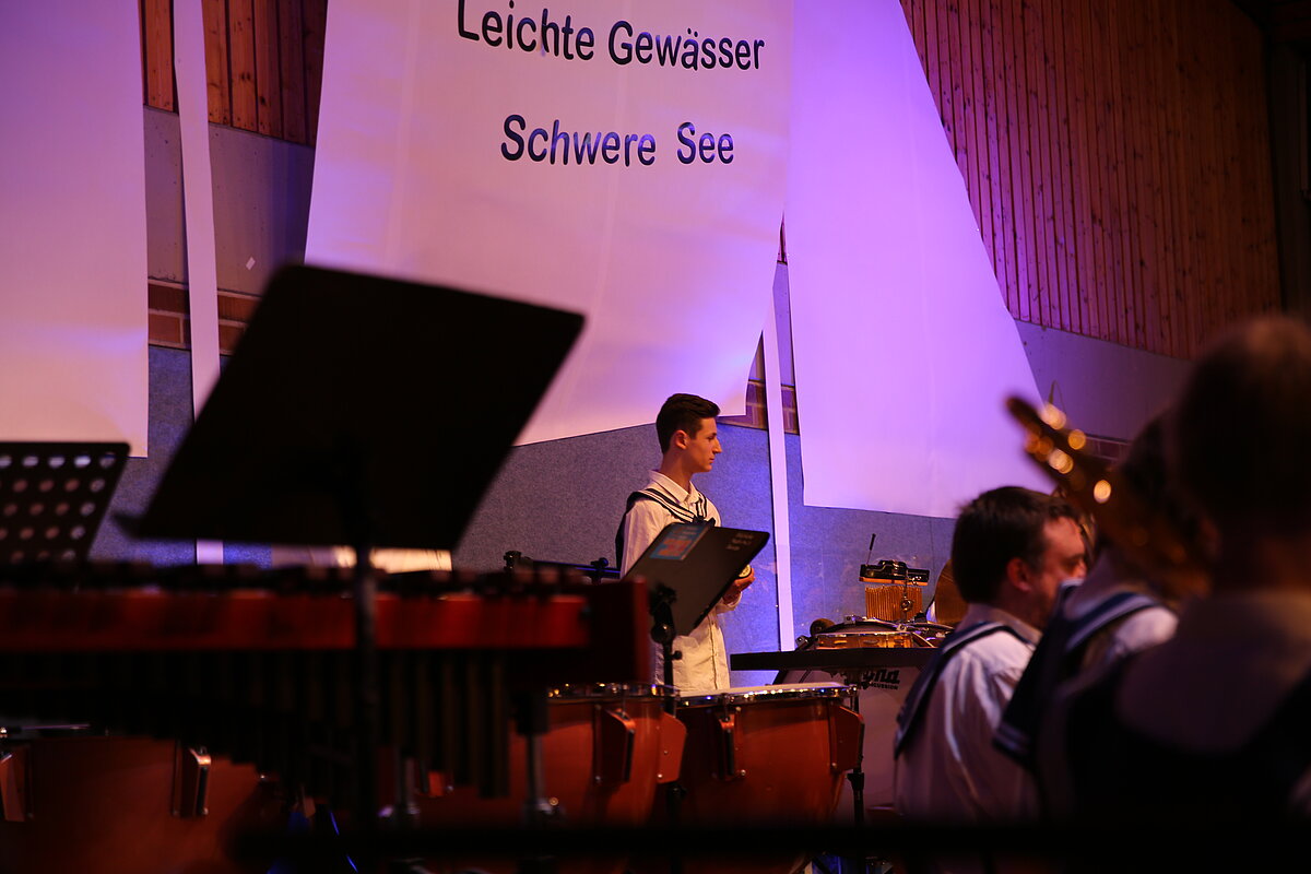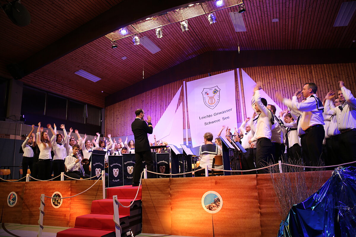 So endete die Fahrt „durch leichte Gewässer und schwere See“, so das Motto des Abends, in einer Hafenkneipe, mit dem Shanty „What Shall We Do with the Drunken Sailor“, für den sich die Musiker in einen stimmgewaltigen Chor mit nur minimaler Instrumentalbegleitung verwandelten. Schon zuvor beim Marinemarsch „Kameraden auf See“ hatten die Dorfmusikanten mit einer Gesangseinlage geglänzt.