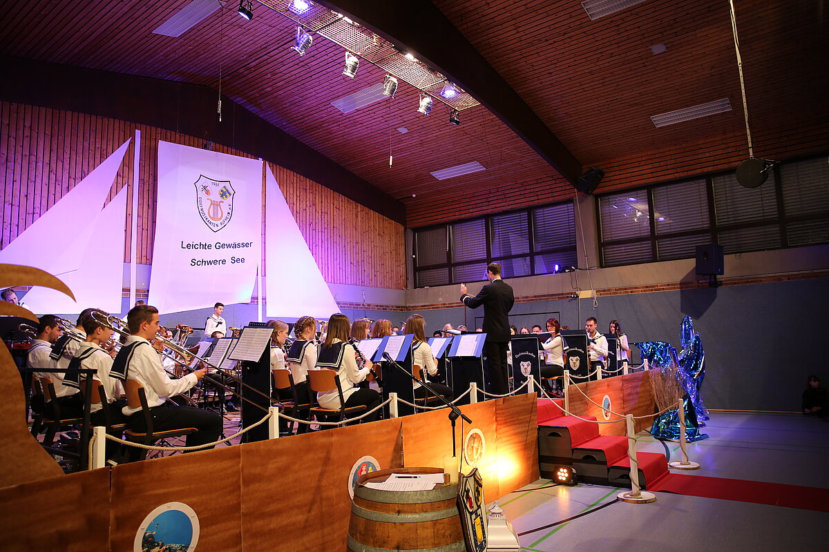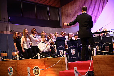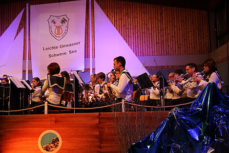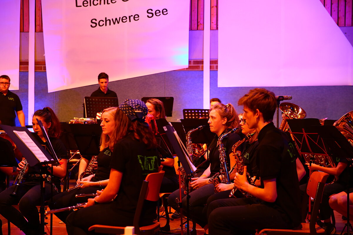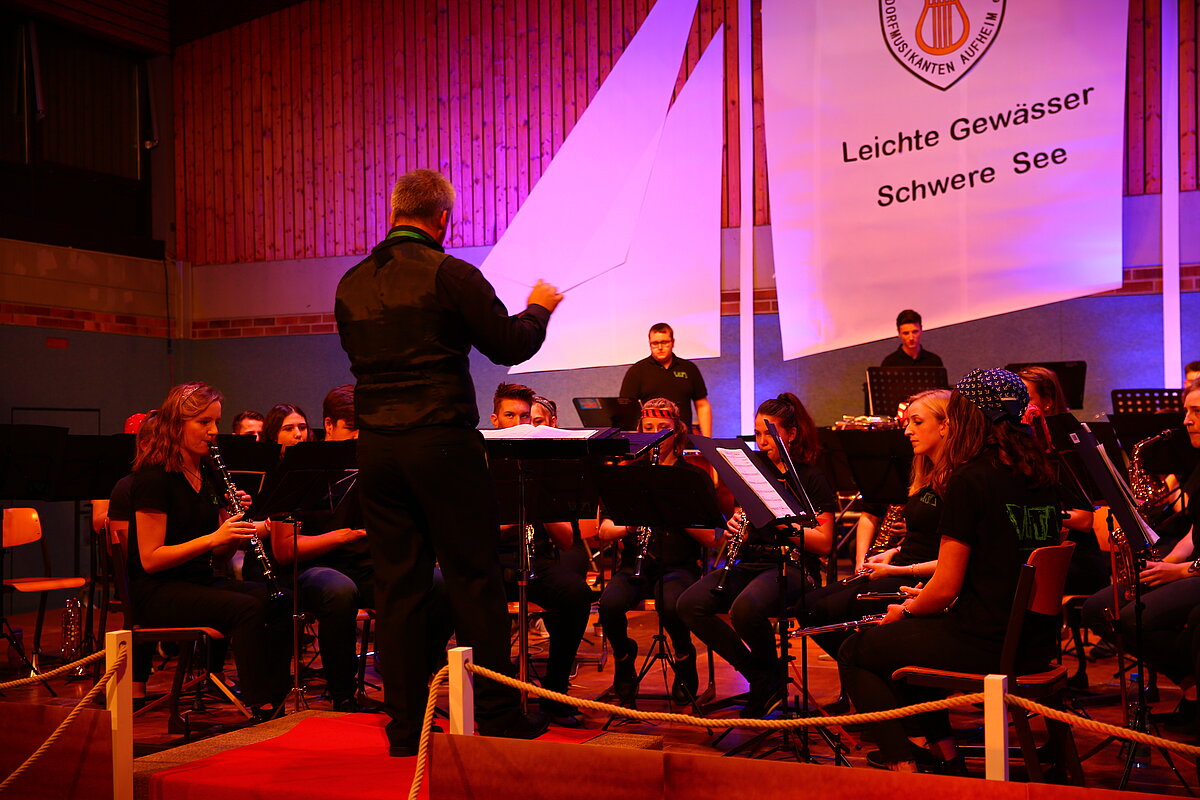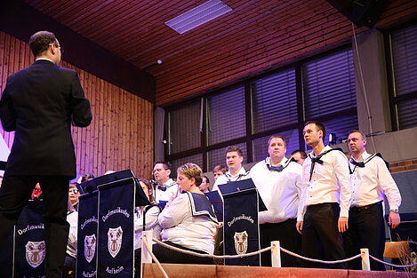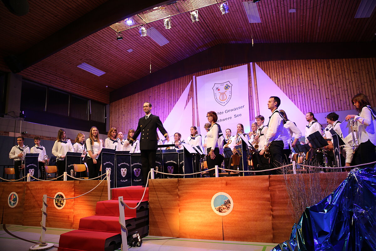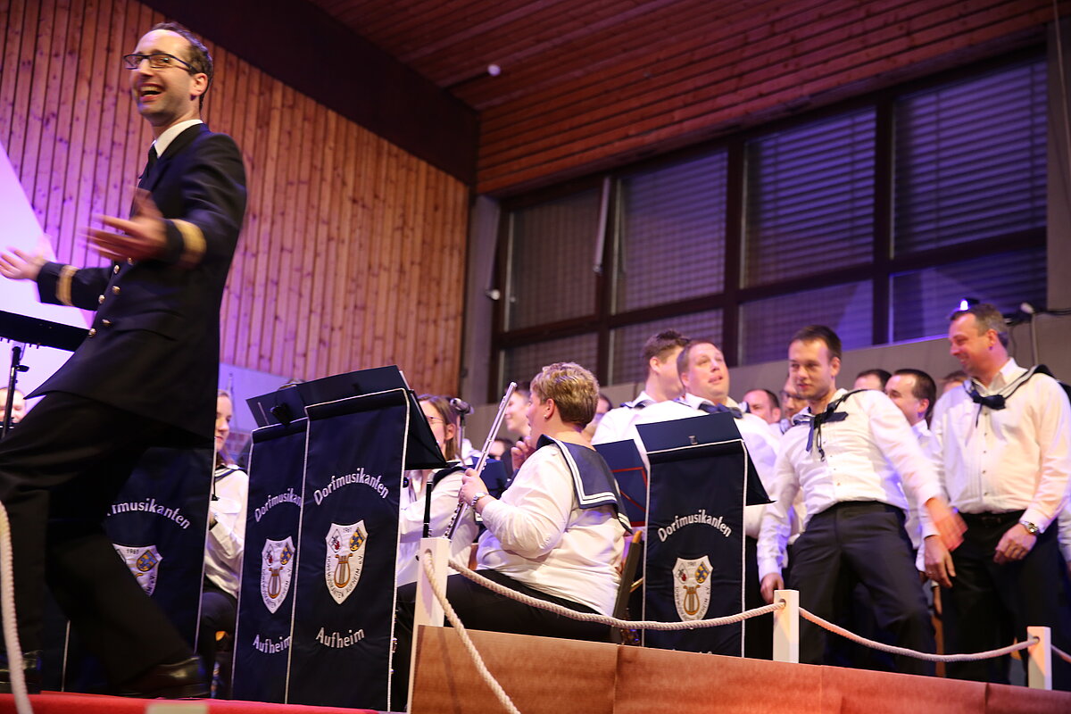 So endete die Fahrt „durch leichte Gewässer und schwere See“, so das Motto des Abends, in einer Hafenkneipe, mit dem Shanty „What Shall We Do with the Drunken Sailor“, für den sich die Musiker in einen stimmgewaltigen Chor mit nur minimaler Instrumentalbegleitung verwandelten. Schon zuvor beim Marinemarsch „Kameraden auf See“ hatten die Dorfmusikanten mit einer Gesangseinlage geglänzt.