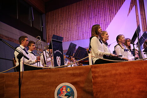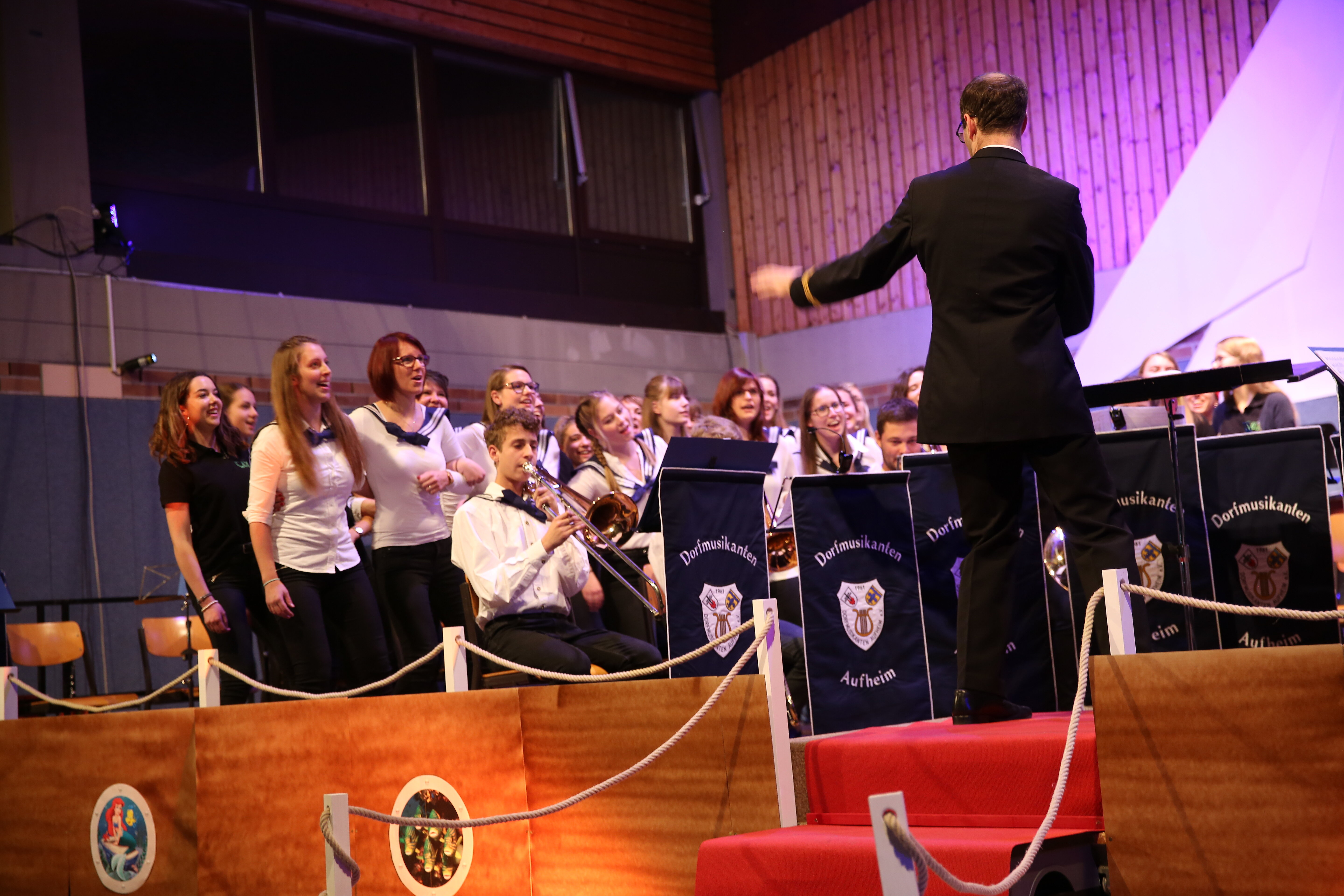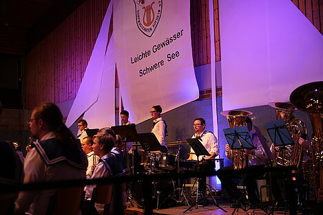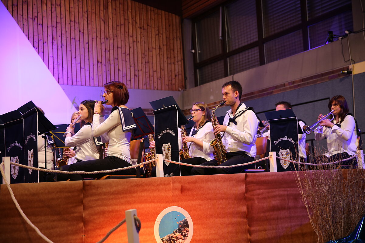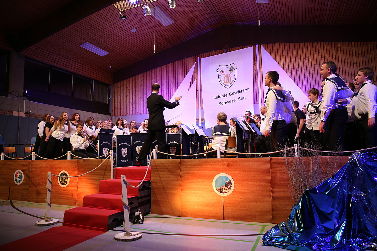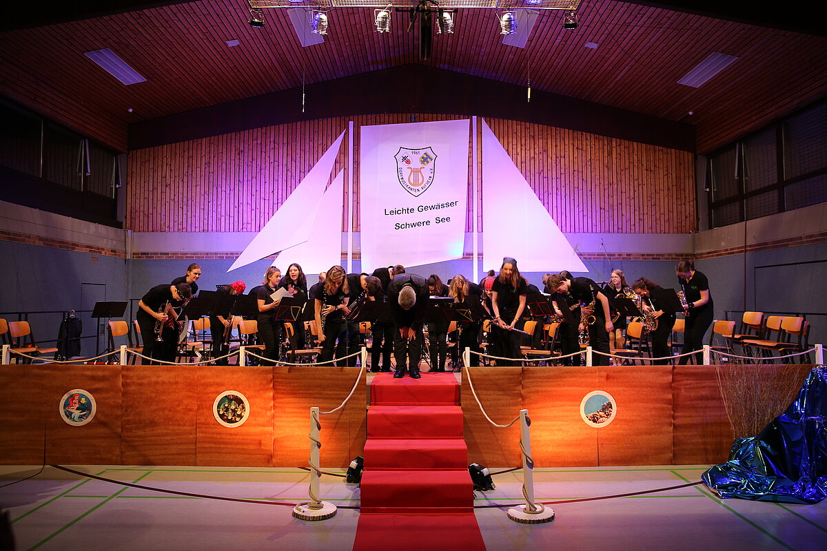 So endete die Fahrt „durch leichte Gewässer und schwere See“, so das Motto des Abends, in einer Hafenkneipe, mit dem Shanty „What Shall We Do with the Drunken Sailor“, für den sich die Musiker in einen stimmgewaltigen Chor mit nur minimaler Instrumentalbegleitung verwandelten. Schon zuvor beim Marinemarsch „Kameraden auf See“ hatten die Dorfmusikanten mit einer Gesangseinlage geglänzt.