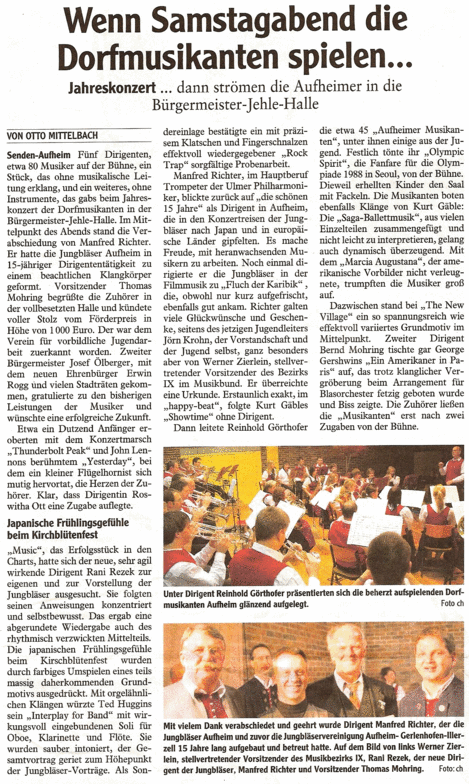 Vor seinem Abschiedsdirigat dankte Manfred Richter mit vielen Emotionen für die Unterstützung in den vergangenen fünfzehn Jahren. Auch die Dorfmusikanten und das Orchester dankten für die geleistete Arbeit und überreichten Geschenke. Der stellvertretende Bezirksvorsitzende des Allgäu-Schwäbischen-Musikbundes Werner Zierlein unterstrich die Bedeutung der Jugendarbeit, verlieh die Ehrennadel für hervorragende Dienste um die Blasmusik und wünschte dem Orchester sowie dem scheidenden Richter alles Gute für die Zukunft. Außerdem überreichte er die Urkunden für absolvierte Bläserprüfungen und ehrte die erfolgreichen Landessieger des Solo-/Duo-Wettbewerbs Michael Görthofer und Andreas Görthofer.