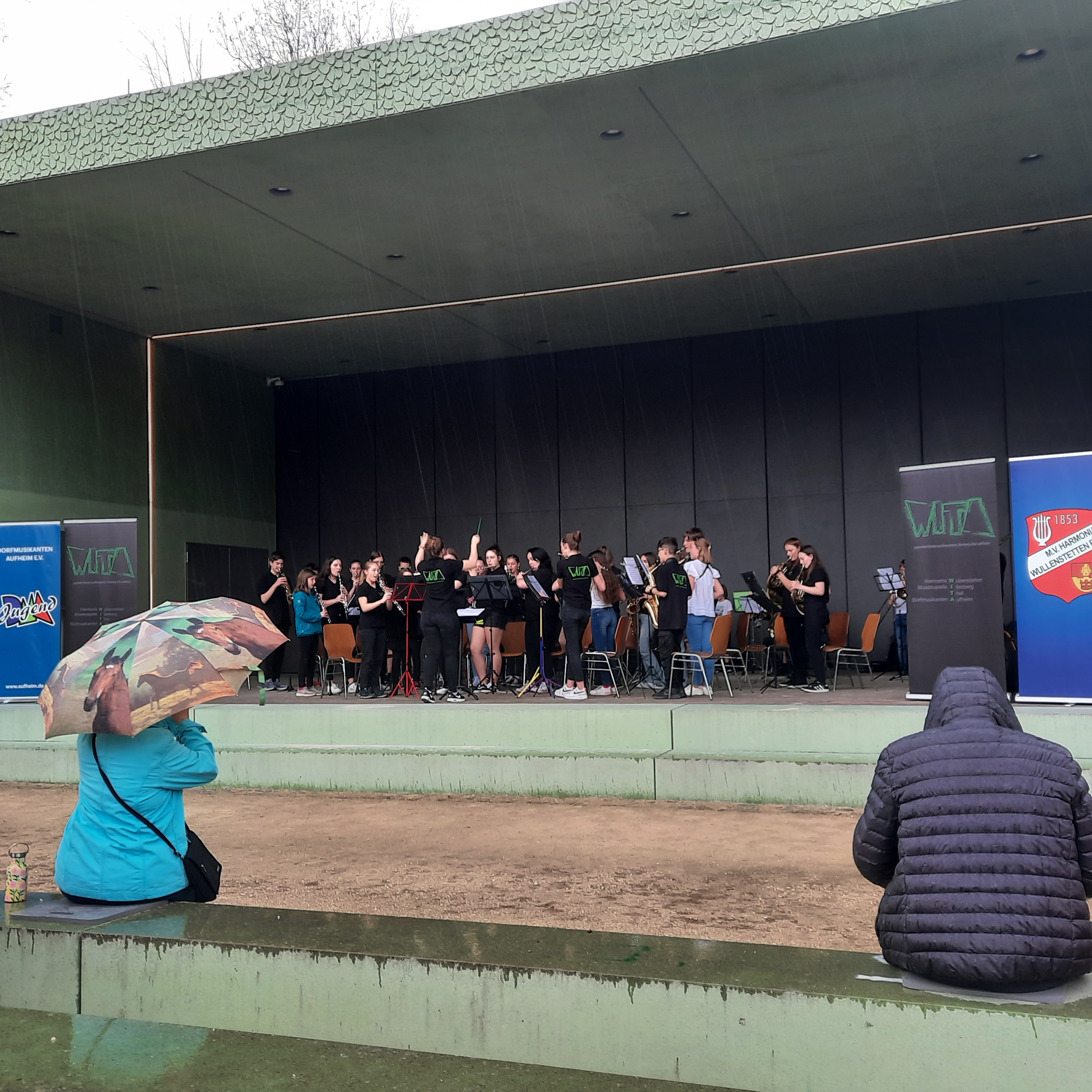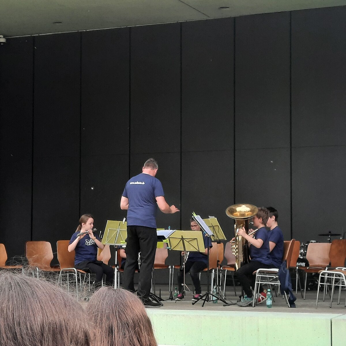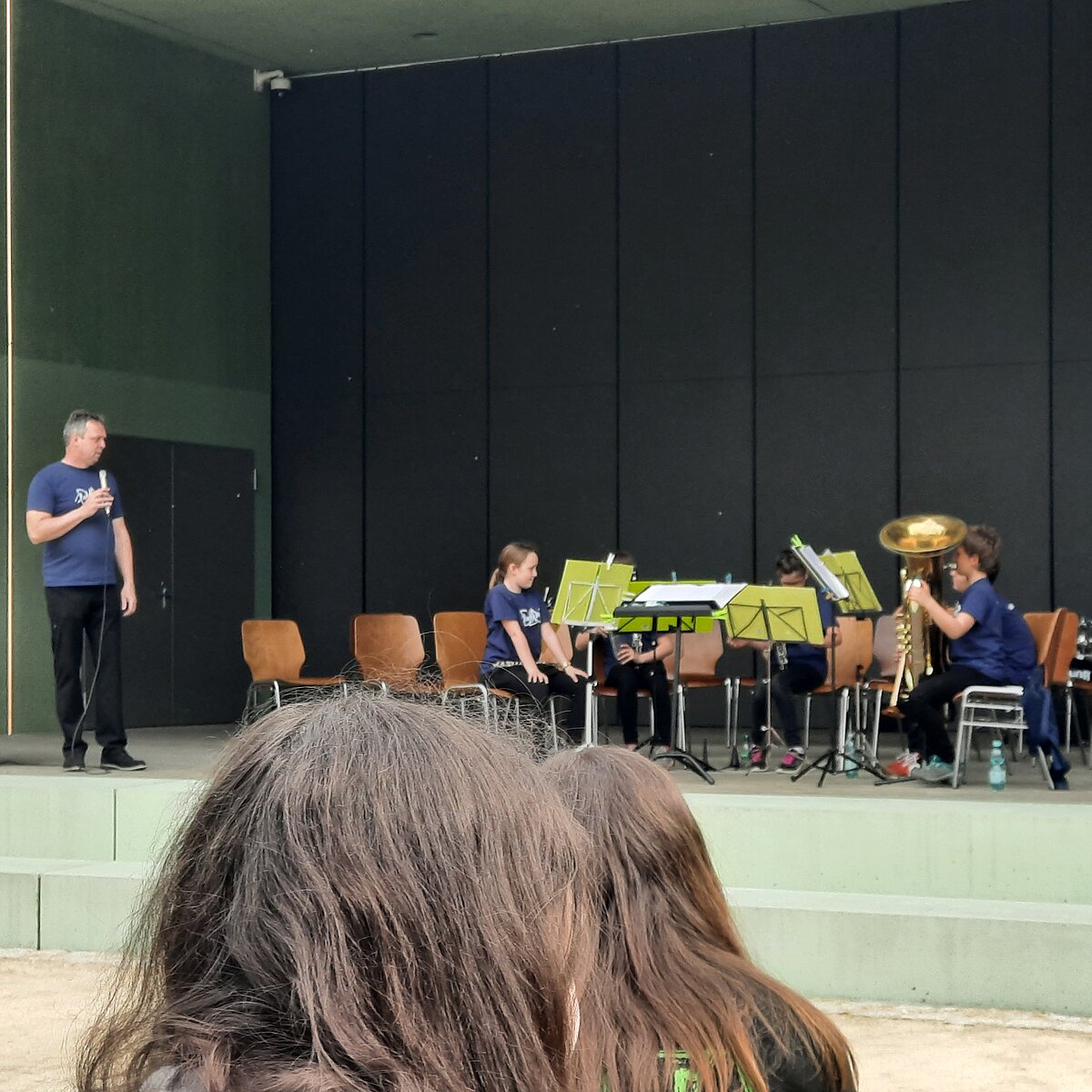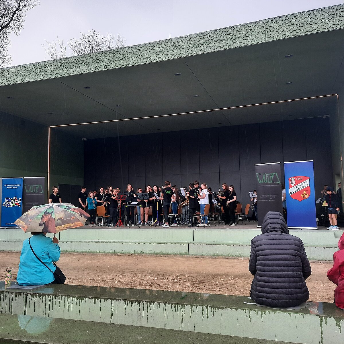 Unsere Anfängergruppe präsentierte sich hierbei mit einem tollen und abwechslungsreichen Programm. Trotz des aufkommenden Donners während dem Auftritt der Notenflöhe, konnten die jungen Musiker das Publikum begeistern. Auch die Wita zeigte ihr Können mit traditioneller und moderner Blasmusik. Dies zeigte sich am Publikum, das trotz dem strömenden Regen auf eine Zugabe nicht verzichten wollte. Die drei Orchester spielten gemeinsam den bekannten Song „Smoke on the Water“ und zeigten damit zu was für einer tollen Leistung schon die jüngsten Musiker fähig sind.