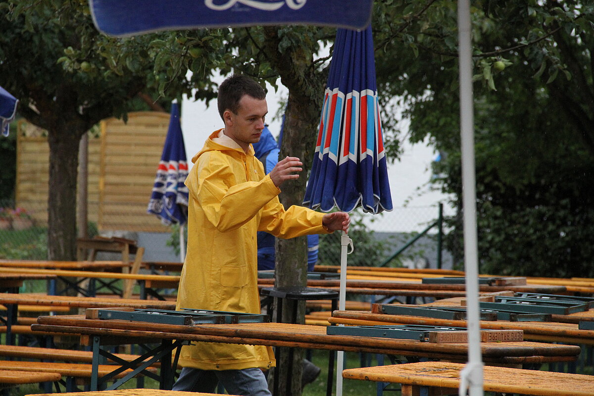 Hubert Pömmer, der Schöpfer und Künstler unseres Maskottchens, dem lebensgroßen Holztubisten "Lothar", war aus Österreich ebenfalls nach Aufheim gekommen und überreichte ein besonderes Jubiläumsgeschenk. Das geschnitzte Jubiläums-Holzwappen mit goldener 50 werden wir spätestens beim Trachten- und Schützenumzug beim Oktoberfest München im Herbst präsentieren. Immer noch bei Dauerregen spielte die Sommertourband Vöhringen zum Festausklang auf. Gegen 21.30 Uhr war die einmalige und unvergessliche Geburtstagsfeier unseres Vereins vorbei.